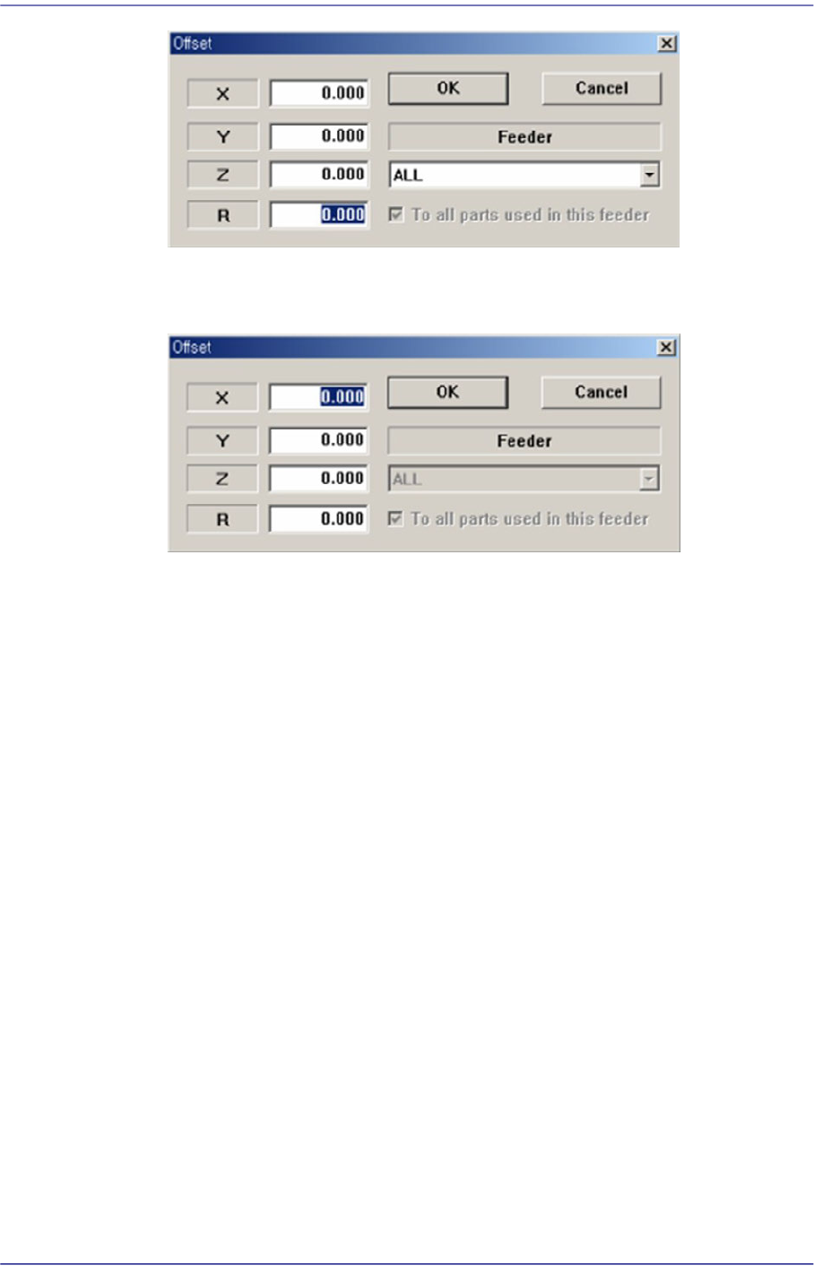 9-8 Fast Flexible Placer SM481(L) PLUS Administ r ator’s Guide <When the row is selected> Apply the offset value to all par t s. <X> edit box Set the X of fse t value. <Y> edit box Set the Y offse…