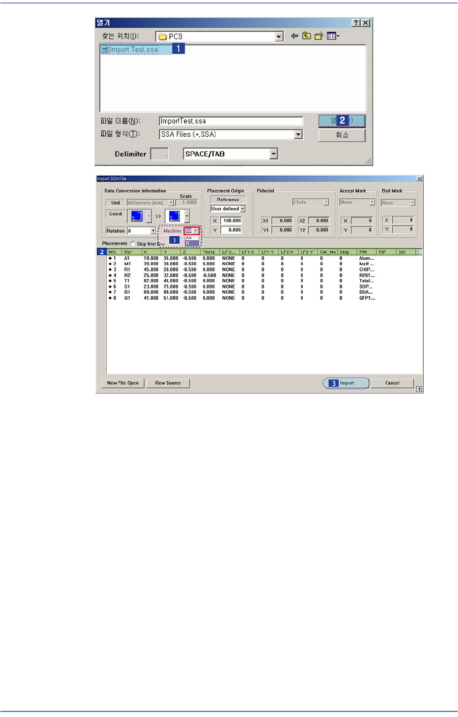 9-10 Fast Flexible Placer SM481(L) PLUS Administ r ator’s Guide If the <Impo rt> button is clicked, the process that converts the corresponding data to the step data is initialized. Click the <Import> butto…