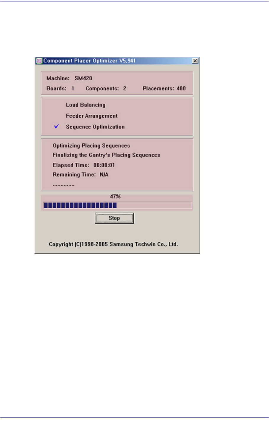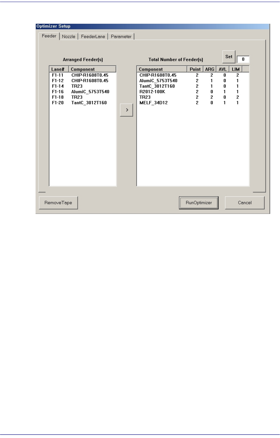 10-12 Fast Flexible Placer SM481(L) PLUS Administ r ator’s Guide 10.5. Ru n Optimi zer <Remove T ape> button Click on the <Remove T ape> button to disregard all the feeders already arranged and to newly arr…
