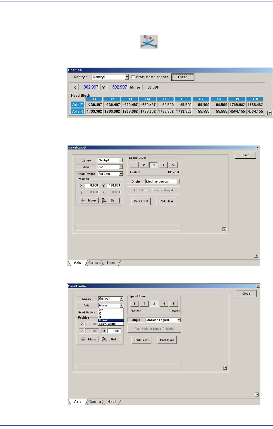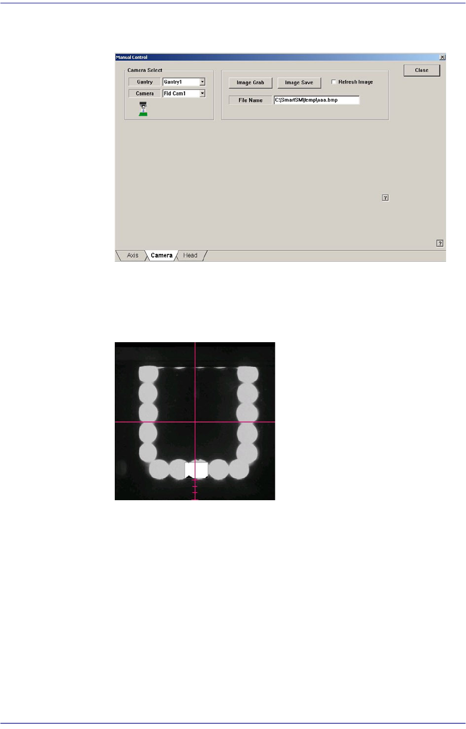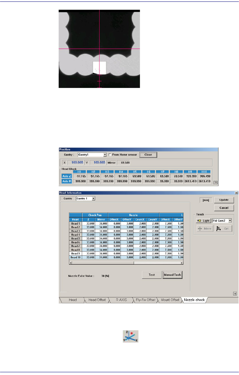 14-15 Machine Calibration 4) In the ‘Camera’ tab d i alog box, select the camera corresponding to the head that wi ll check the existance of the nozzle. 5) Operate th e mot or t ha t dr i ves the mirror -axis b y using t…