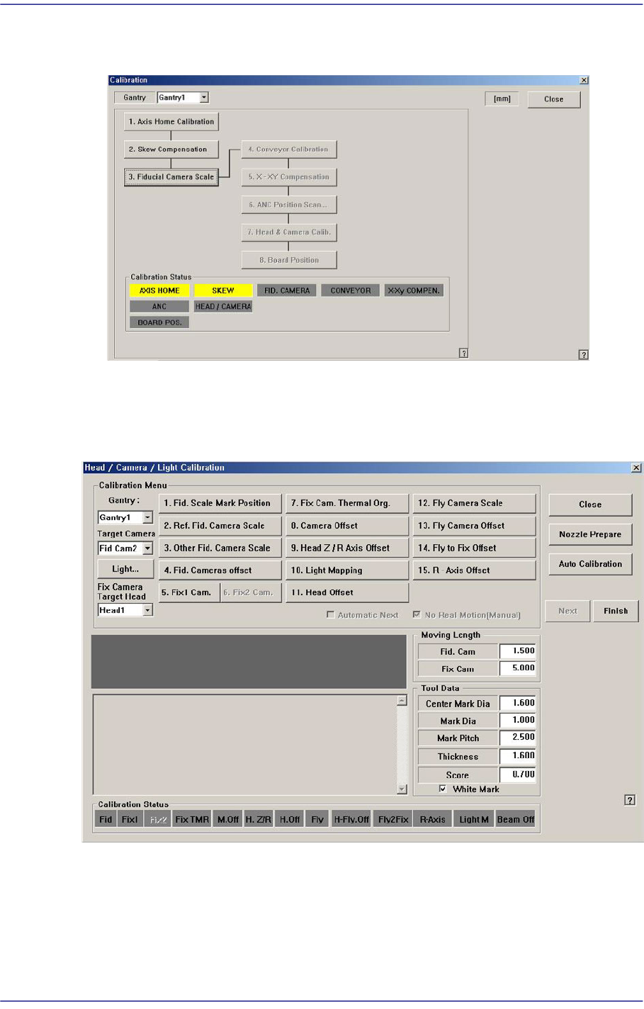 14-29 Machine Calibration <1. Fid. Scale Mark P osition> button Set the position of t he reference fiducial mark located at the top surface of the ANC. When performing the scale calibration of the fiducial camera…