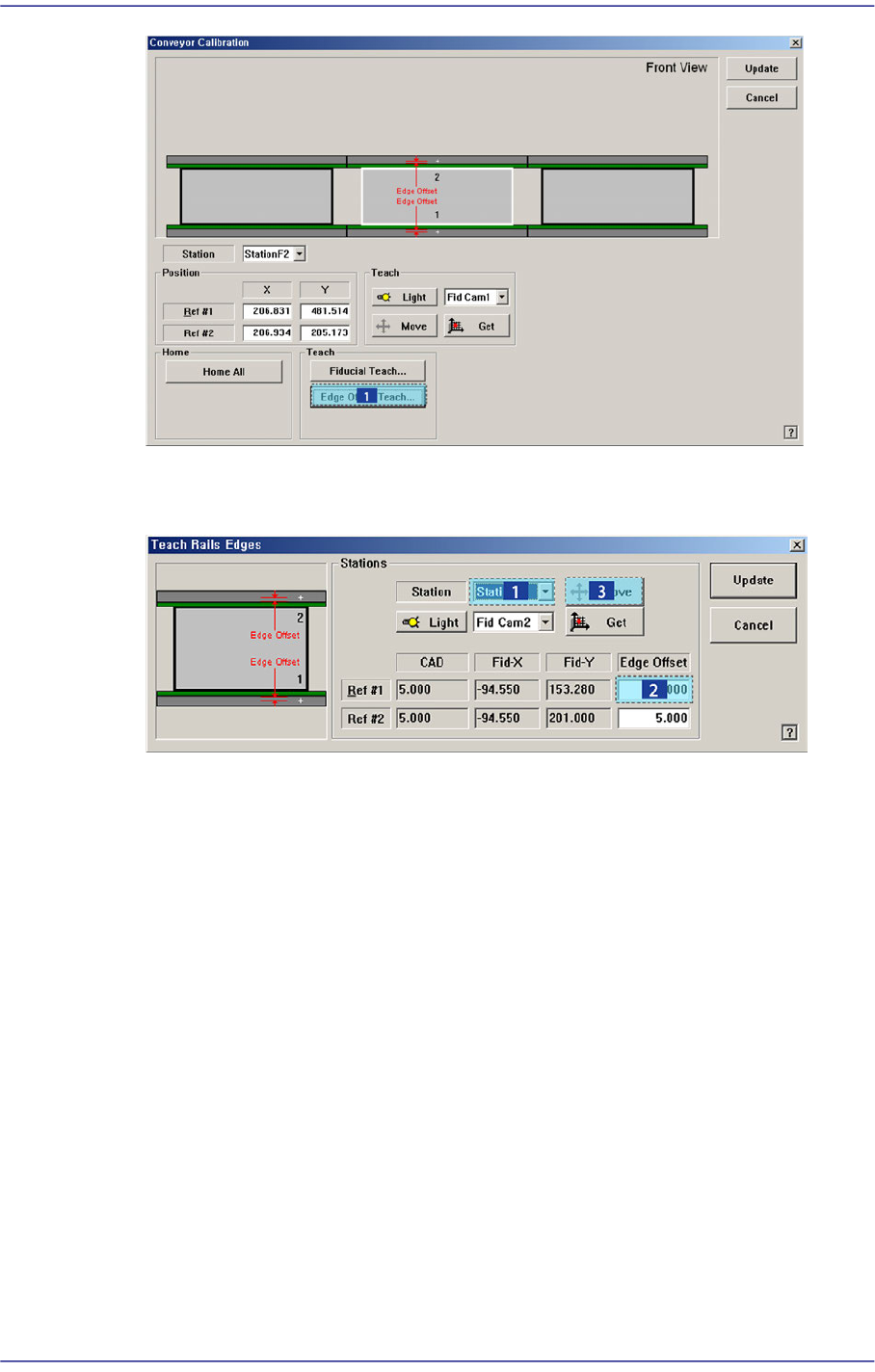 14-37 Machine Calibration 8. When matched, press the ‘Enter’ button in the teaching box. 9. Select the corre sponding <Edge Offset> e d it box in ‘Ref. #2’ and click the <M ove Cam> button . 10. Pe rform teac…