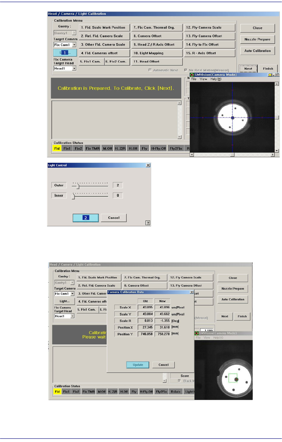 14-47 Machine Calibration Memo The range o f t h e r eference va lues for the ‘ fly-camera calibration’ is as follows:. Mega FOV 3 5 ScaleX:33.1~36.1 ( μm/pixel) ScaleY : 33.1~36.1 (μm/pixel) R:-1~1(deg) Mega FOV 4 5…