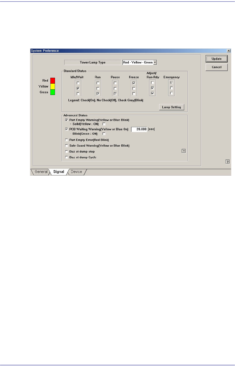 15-35 System Setup If the red lamp is turned on, the equipme nt stops. Ther ef ore, if the er ror can be neglected according to the type of the err or, select the corr e sponding error and select the <Y ellow> chec…