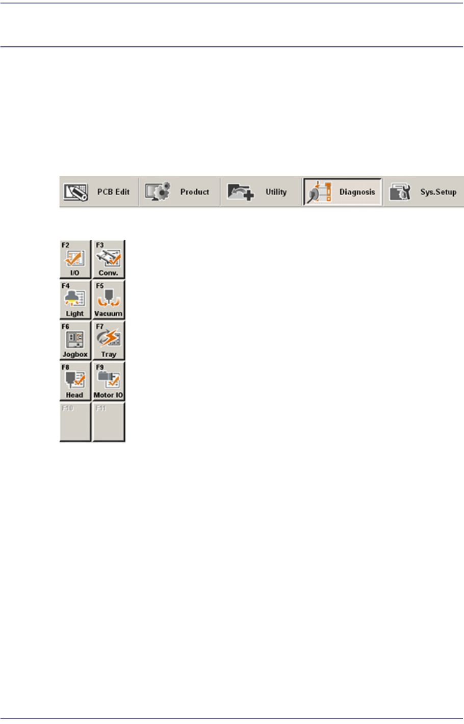 The Diagnosis menu is composed of 6submenus: I/O, Conveyor, Light, Vacuum, Jog box,