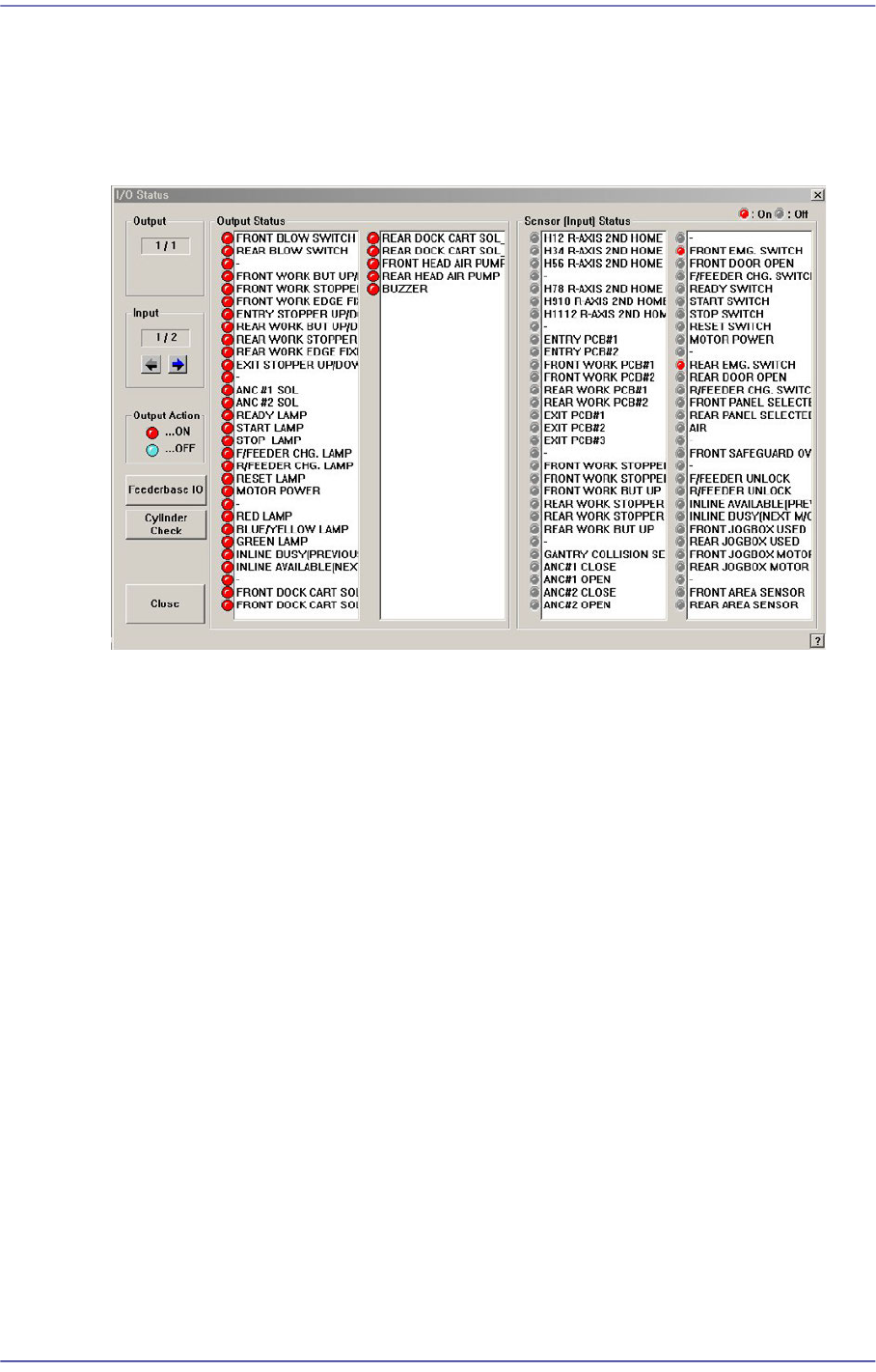 16-2 Fast Flexible Placer SM481(L) PLUS Administ r ator’s Guide 16.1. I/O [F2] The <I/O> su bmenu sets or dis plays the status of various I/O (input/output) sensors on the equipment. Figure16.3 “I/O S tatus “dialog…
