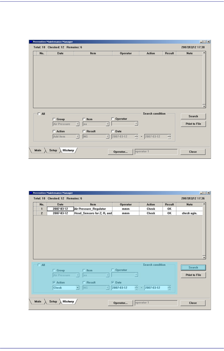 19-16 Fast Flexible Placer SM481(L) PLUS Administ r ator’s Guide 19.6. Hist ory Screen All check histories can be inquired in t he History Screen. Figure19.14 History Screen When inquiring the check history , input the s…
