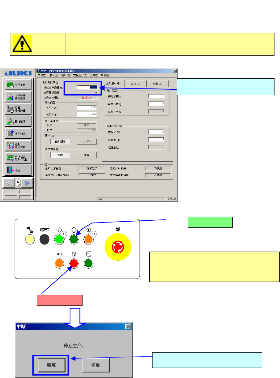 操作手册Ⅰ Rev00 步骤 9 执行生产 在“基板生产”画面上设置“计划生产数量”后,再按下[开始]开关。 生产即开始。(生产画面的详细内容,请参见『操作手册Ⅱ』的“2-8-2 生产条件画面”。) 按下[开始]开关后装置即开始运行。为防止受 伤, 请绝对不要把手 或头部等伸进装置内部 。 警告 ① 请输入计划生产数量。 ② <操作面板> 请 按 下 生产即开始。 按 1 次 ,则进入暂停状态。再按 1 次,则显示中断画面。 停止开关 …