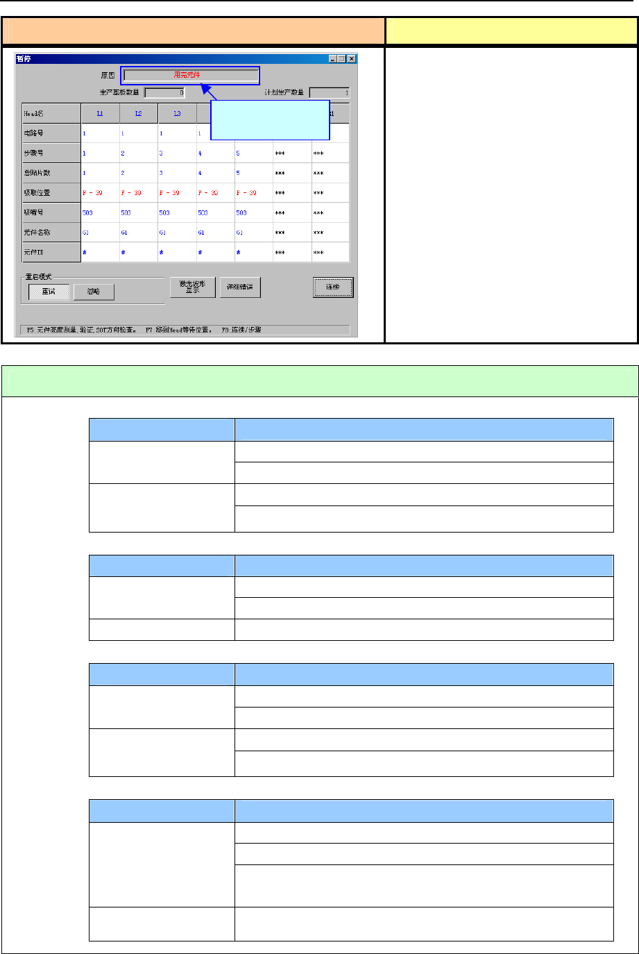 1) 遇到「激光脏污错误」时,贴片头将移动到前面后暂停。