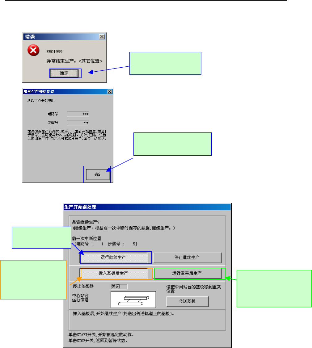 操作手册Ⅰ Rev00 在「生产开始前处理」画面上按下开始按钮时,显示如下画面。 选择「运行」 ,并在图像监视器上目检,确认贴片点“已贴片”或“未贴片” 。 不用摄像机确认重新贴片位置、直 接开始贴片动作时,选 择此按钮。 为检查再贴片点有无错误,要用摄 像机确认再贴片点时, 选择此按钮。 图像监视器确认动作结束后,显示如下画面。 准备重新贴片的贴片点 上已经完成贴片时, 选择此按钮。 准备重新贴片的贴片点 上尚未贴片时,选择此按钮。 …