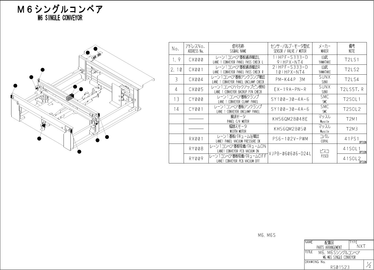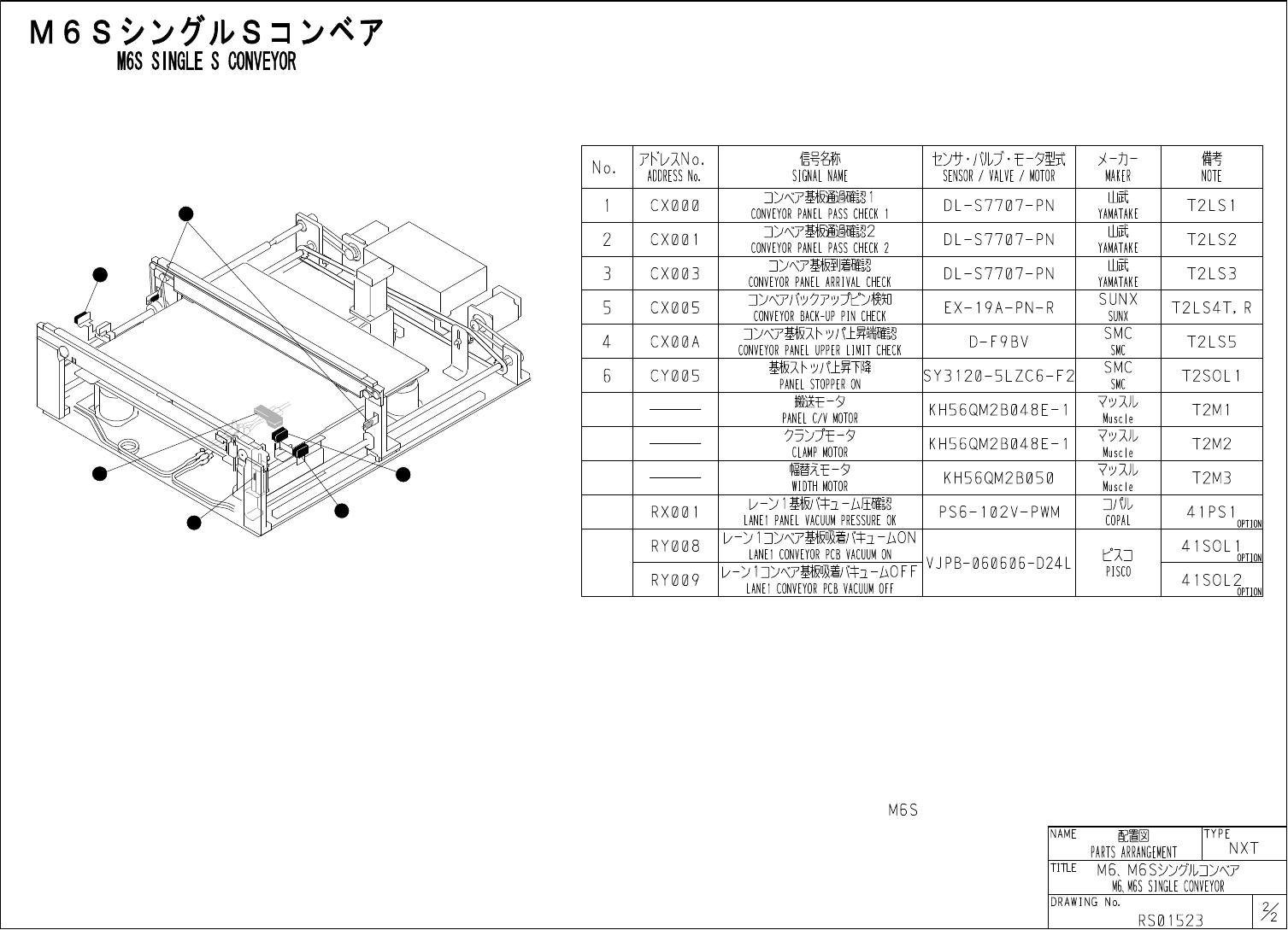 1 2 6 3 5 4 M 6 M 6 S SINGLE S CONVEYOR 信号视 ' SIGNAL NAME 廿 / 卩以吁 - 夕型式 SENSOR / VALVE / MOTOR 備考 7 KV ^ No . ADDRESS No . 夕 - 力 - No . MAKER NOTE 基板耀確認 1 CONVEYOR PANEL PASS CHECK 1 山武 C X 0 0 0 D L - S 7 7 0 7 -…
