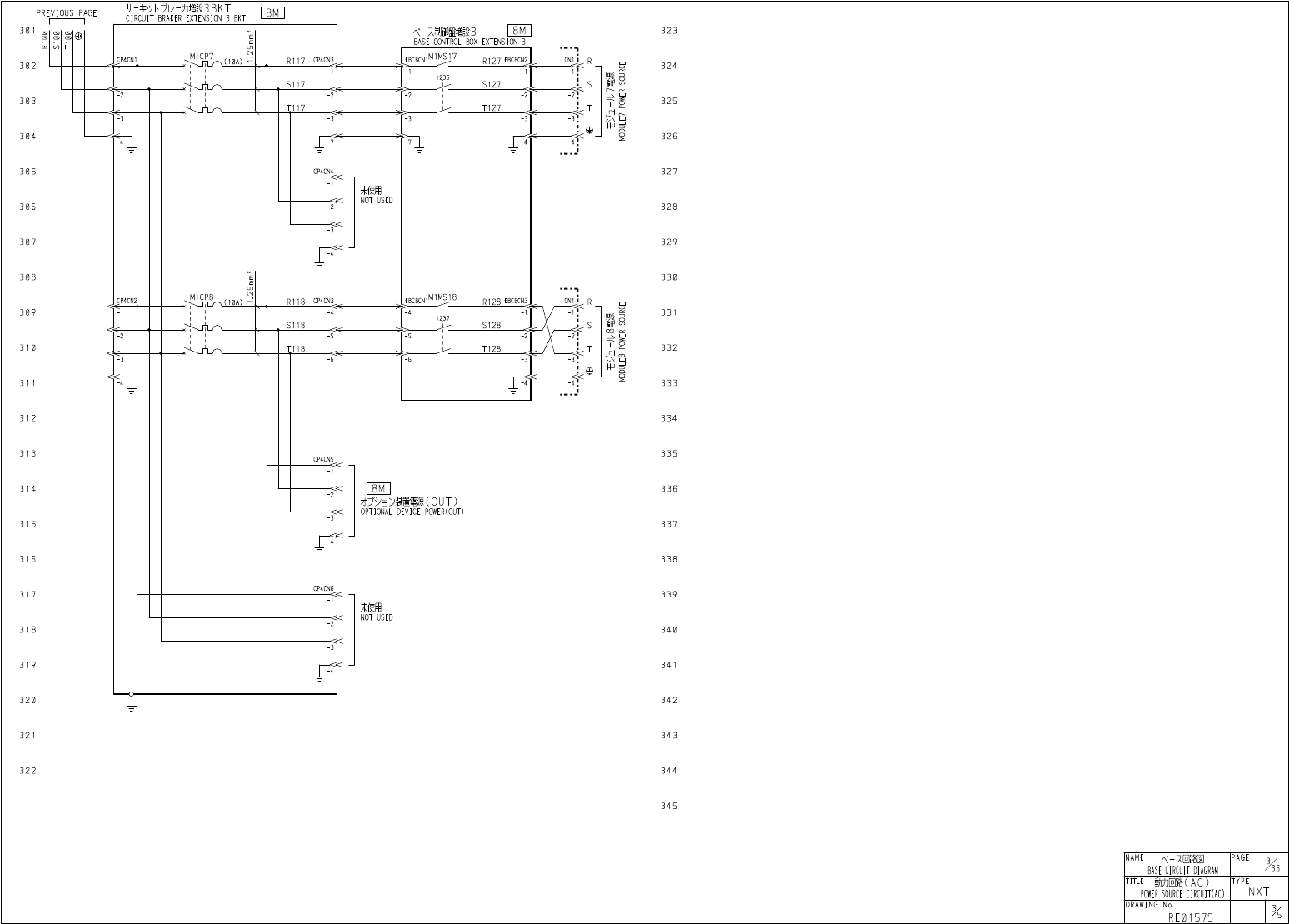 《 - 又回路図 BASE CIRCUIT DIAGRAM N A M E P A G E X e T I T L E 動力回路 ( A C ) POWER SOURCE CIRCUIKAC ) T Y P E N X T D R A W I N G N o . R E 01575 廿 - 牛外 H 増設 3 B K T C I R C U I T B R A K E R E X T E N S I O N 3 B K T 8 M P …