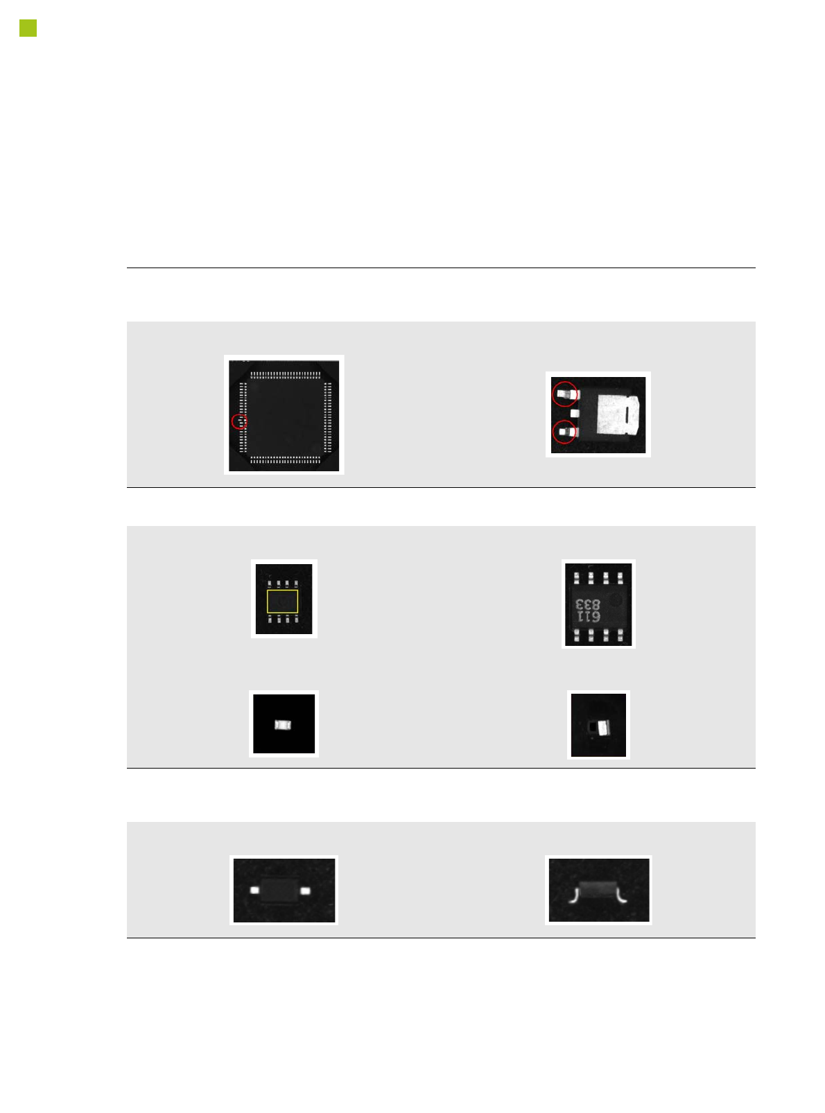 Both chip and IC component shapes (e.g. SOT) recognized in flipped (turned face down) or upright state.