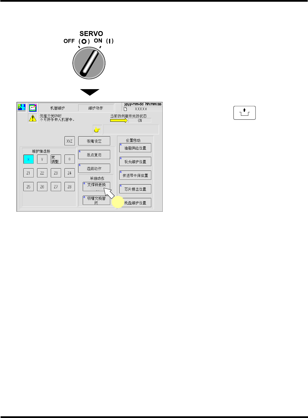 CM101-D 维修手册 1.4 140 小时检查一次 ( 一周一次 ) Pa ge 1- 78 1.4.5 线阵照相机玻璃罩的清扫 使用工具 棉纱布等 需要时间 1 分钟 要求 该维护作业在电源开关处于 ON ( I ) 的状态下也可进行。在吸头的动作范围内进行作 业时,请务必将伺服开关置于 OFF (O) 后再打开安全盖。 ( 打开安全盖可以切断向 XY 电机的供电 ) 请按以下步骤清扫线阵 照相机玻璃罩。玻璃罩上积 有灰尘等污物,…