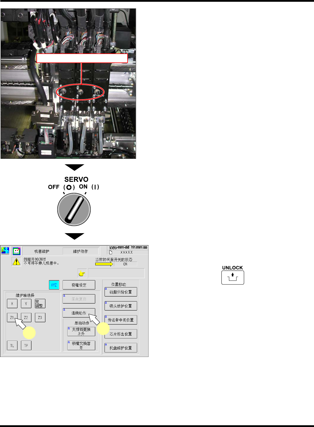 CM101-D 维修手册 1.6 560 小时检查一次 ( 每月一次 ) Page 1-1 28 5. 从后侧向吸头的润滑脂注入口注油。 • 对每个润滑脂注入口压 出 1 次 ( 约 0.9 cm 3 ) • 使用润滑脂 : MP 润滑脂 2S 6. 关闭后侧的盖,将伺服开关置于 ON ( I ) 。 7. 按 ‘ 维护轴选择 ’ 的 [Z1] 。 8. 按操作面板上的 + [ 连续动作 ] 。 • 对 [Z2], [Z3] 也将进行步…