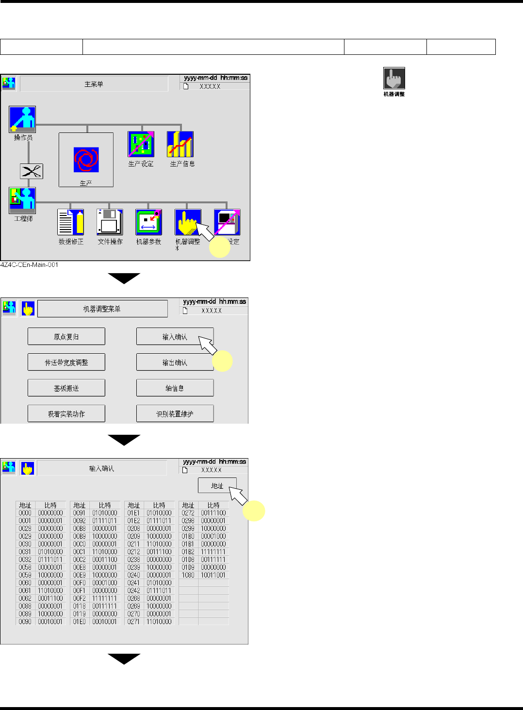 CM101-D 维修手册 1.6 560 小时检查一次 ( 每月一次 ) Page 1-1 34 1.6.12 盖的安全开关检查 使用工具 − 需要时间 10 分钟 1. 按 < 主菜单 > 画面的 键。 • 显示 < 机器调整菜单 > 画面。 2. 按 [ 输入确认 ] 键。 • 显示 < 输入确认 > 画面。 3. 按 [ 地址 ] 键。 下一页 EJM4A -Ma-0007 3 1 EJM4A …