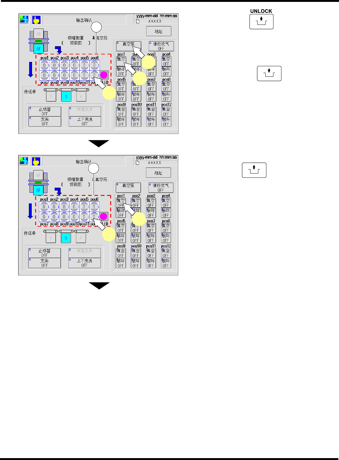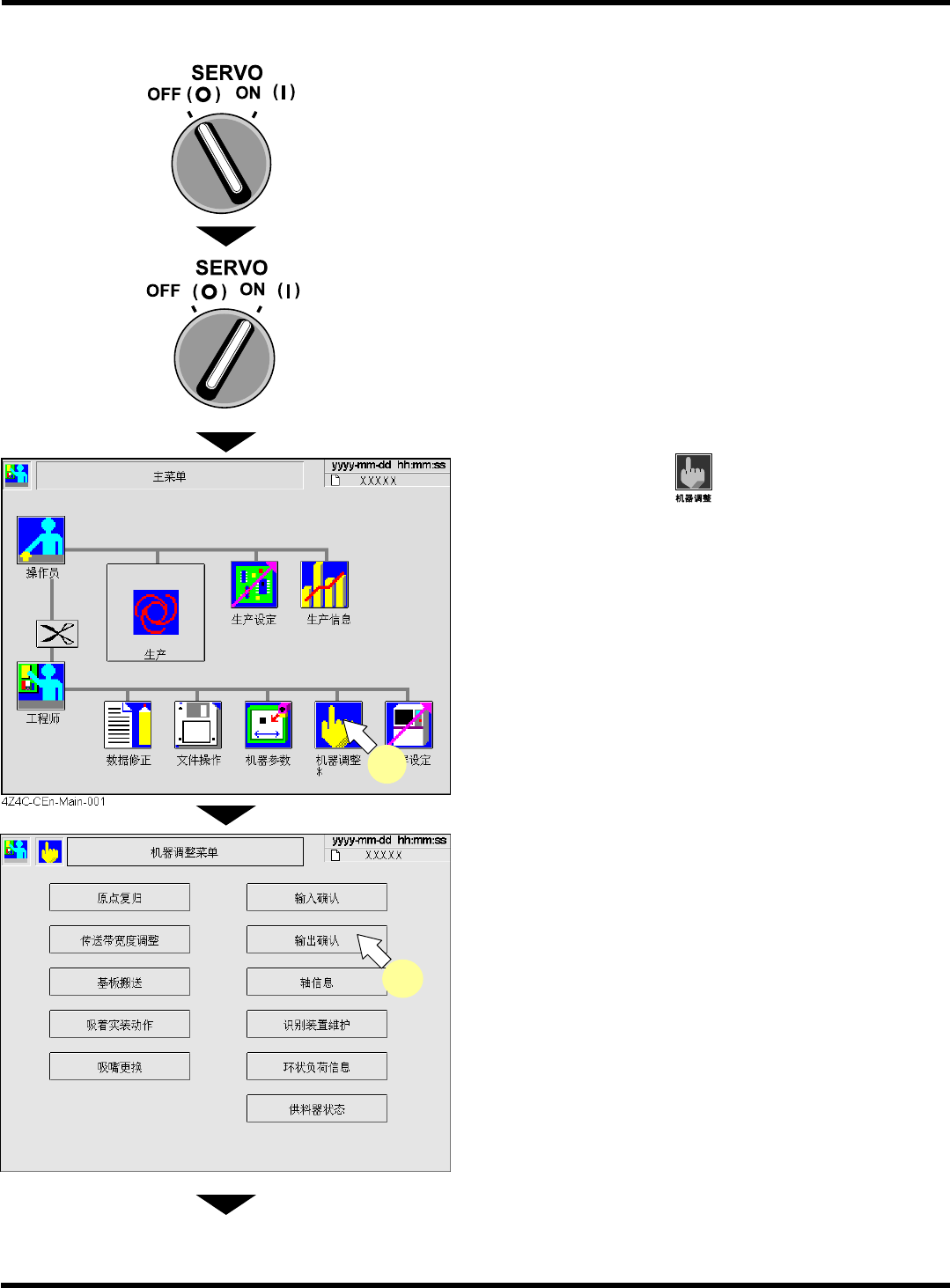 CM101-D 维修手册 1.10 消耗零件的更换 Page 1-1 64 动作确认步骤 1. 将伺服开关置于 OFF (O) 。 2. 将吸嘴安装在更换后的吹气阀的吸头上。 3. 将伺服开关置于 ON ( I ) 。 4. 按 < 主菜单 > 画面 键。 • 显示 < 机器调整菜单 > 画面。 5. 按 [ 输出确认 ] 键。 • 显示 < 输出确认 > 画面。 下一页 4 EJM4 A -Ma…