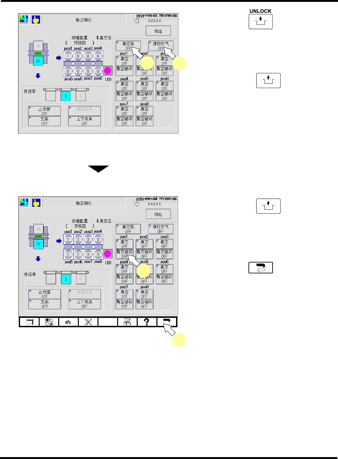CM101-D 维修手册 1.10 消耗零件的更换 Page 1-1 74 4. 按操作面板的 + [ 真空泵 ] 。 • 真空泵启动显示从 OFF 变为 ON 。 5. 按操作面板上的 UNLOCK + pos1 的 [ 真空 破坏 ] 键。 • 显示状态将从 OFF 变为 ON 状态, 从吸嘴处将 喷出破坏真空压力的空 气。 6. 按操作面板上的 UNLOCK + [ 清扫吹气 ] 键。 • 显示状态将从 OFF 变为 ON ,从吸…