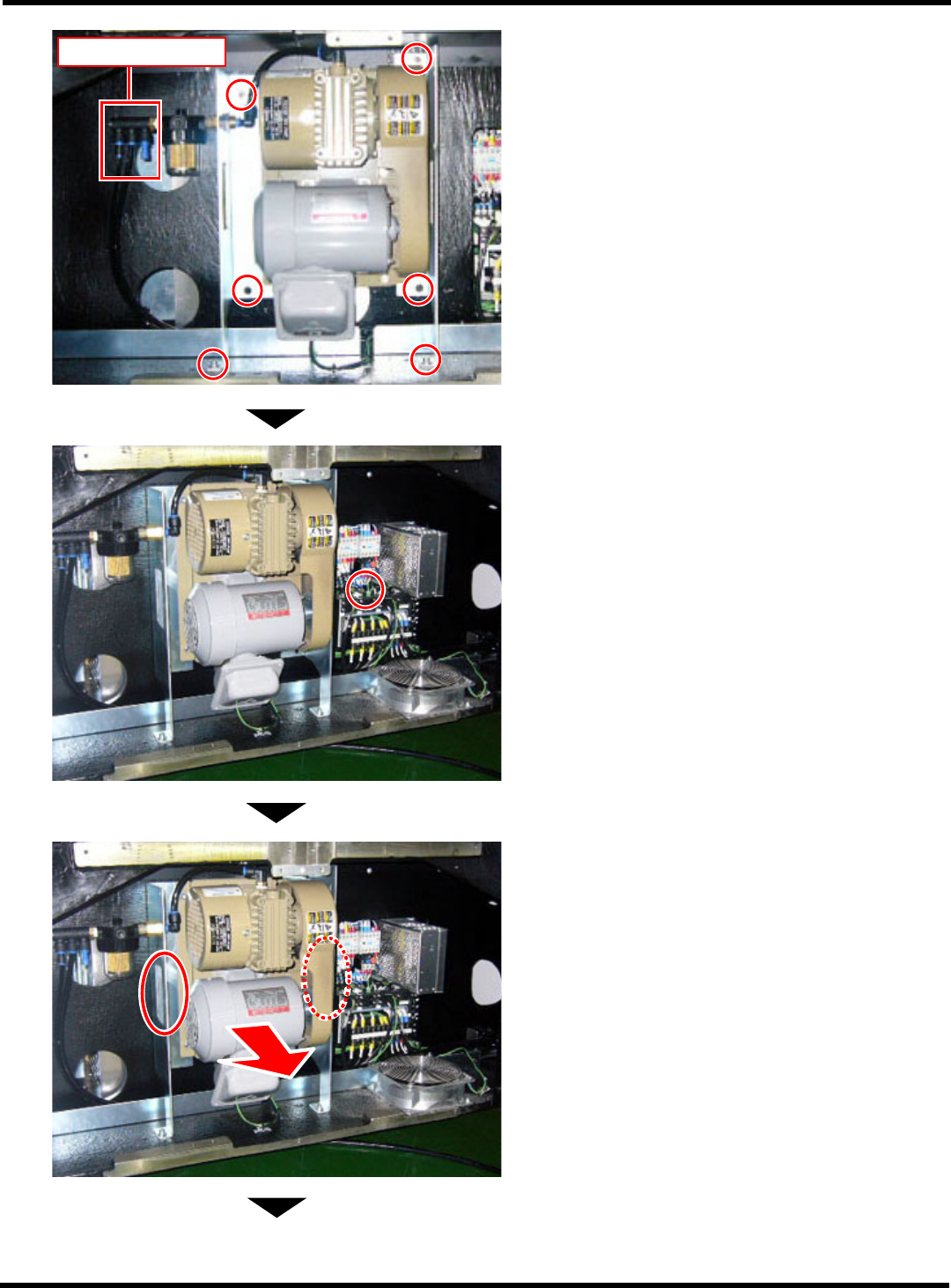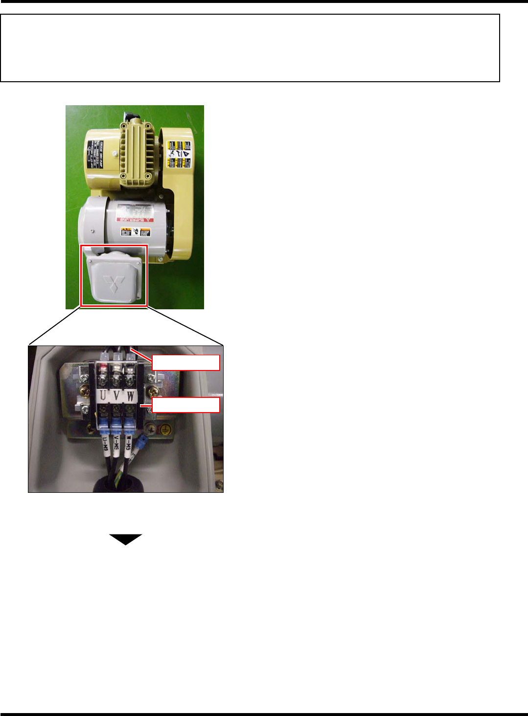 CM101-D 维修手册 1.10 消耗零件的更换 Page 1-1 82 通知 在打开配电部之前,请务必将机器主体的电源置于 OFF (O) 。 卸下与配电部相连接的配线 (4 根 ) 。 请注意不要弄错配线的序号。如果配线的序号错误,真空泵电机有可能发生逆转。 7. 打开取出的真空泵配电部。 8. 卸下与配电部相连接的配线 (4 根 ) ,连接 好新的真空泵配线。 ∗ 连接时, 请注意要使配 线的符号 (U,V,W) 和端 子台的符…