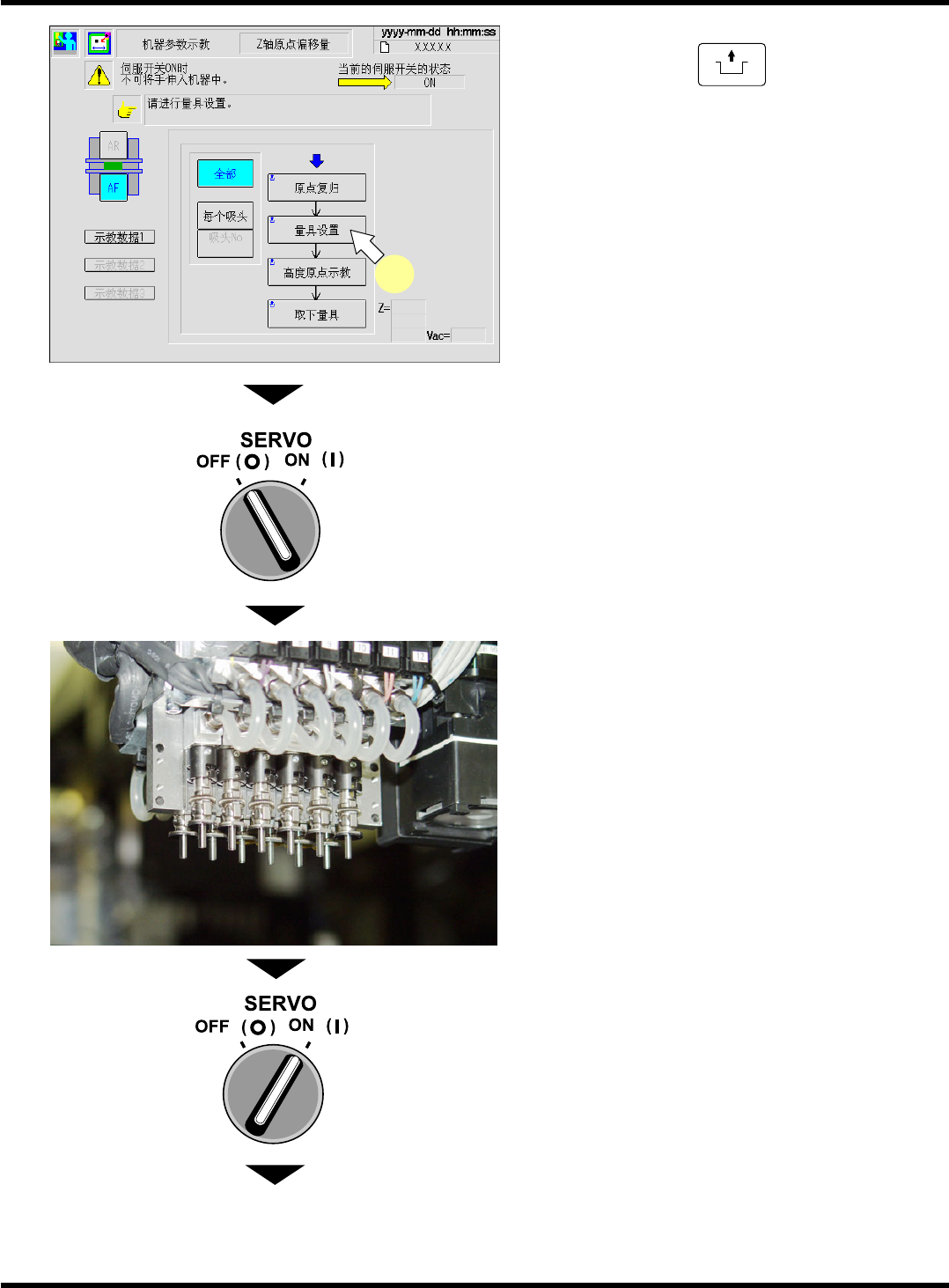 CM101-D 维修手册 2.2 机器参数的示教步 骤 Pa ge 2- 38 9. 按操作面板的 UNLOCK + [ 高度原点示 教 ] 。 10. 按操作面板的 UNLOCK + [ 取下量具 ] 。 11. 将伺服开关置于 OFF (O) 状态。 12. 打开安全盖。 13. 取下吸嘴。 14. 关闭安全盖。 15. 将伺服开关置于 ON ( I ) 状态。 下一页 EJM5B -Mp-0027 9 EJM5B -Mp-0028…