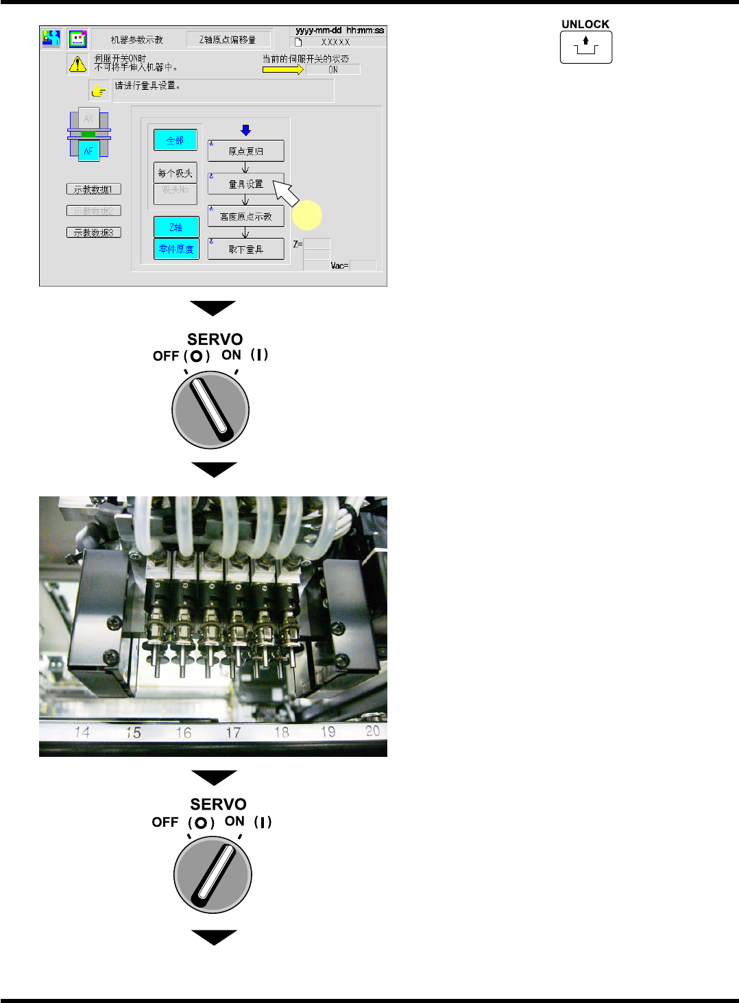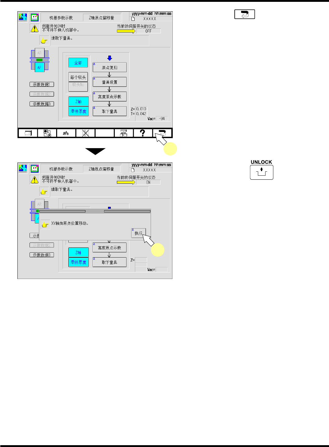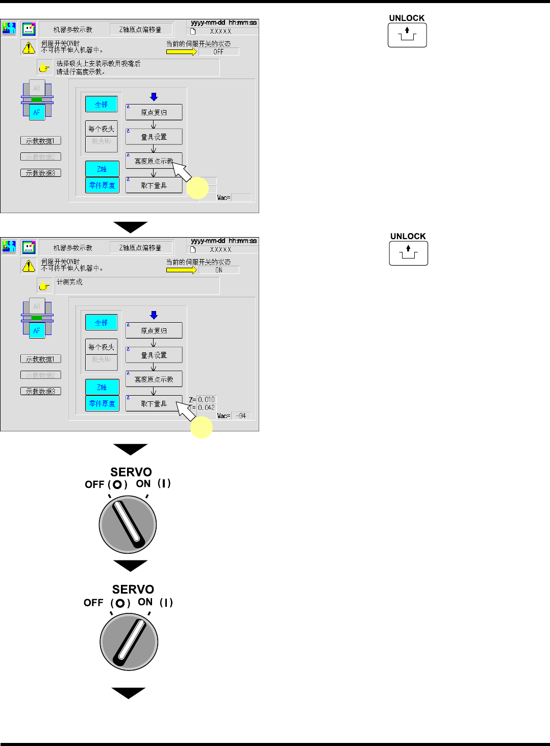 CM101-D 维修手册 2.2 机器参数的示教步 骤 Pa ge 2- 46 10. 按操作面板上的 + [ 高度原点示 教 ] 。 • 开始示教。 ∗ 示教结束后,请确认 “ 计测结束 ” 的信息显示后, 再进行下一个步骤。 11. 按操作面板上的 + [ 取下量具 ] 。 • 吸头将会移至取下位置 。 12. 将伺服开关置于 OFF (O) 。 13. 打开安全盖。 14. 取下吸嘴。 15. 关闭安全盖。 16. 将伺服开关置于…