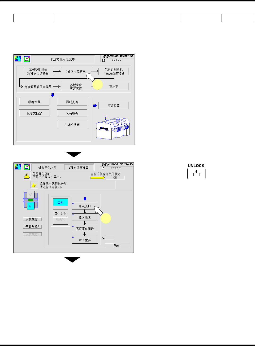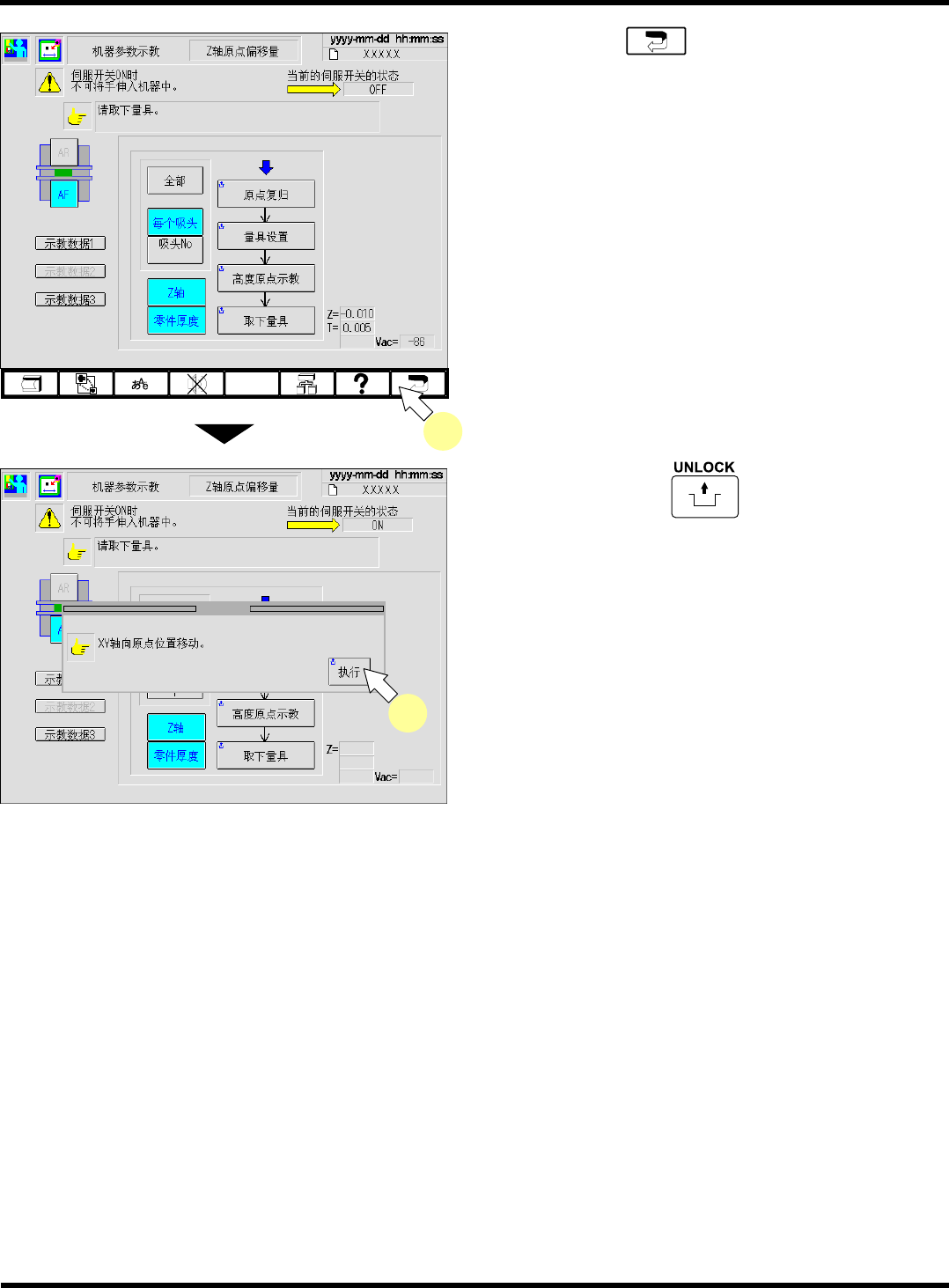 CM101-D 维修手册 2.2 机器参数的示教步 骤 Pa ge 2- 52 19. 按功能键的 。 20. 按操作面板上的 + [ 执行 ] 。 • 吸头将会移至原点位置 。 EJM5B -Mp-0157 20 EJM5B -Mp-0151 19 EJM5B- C-MMC02-A02-0 0