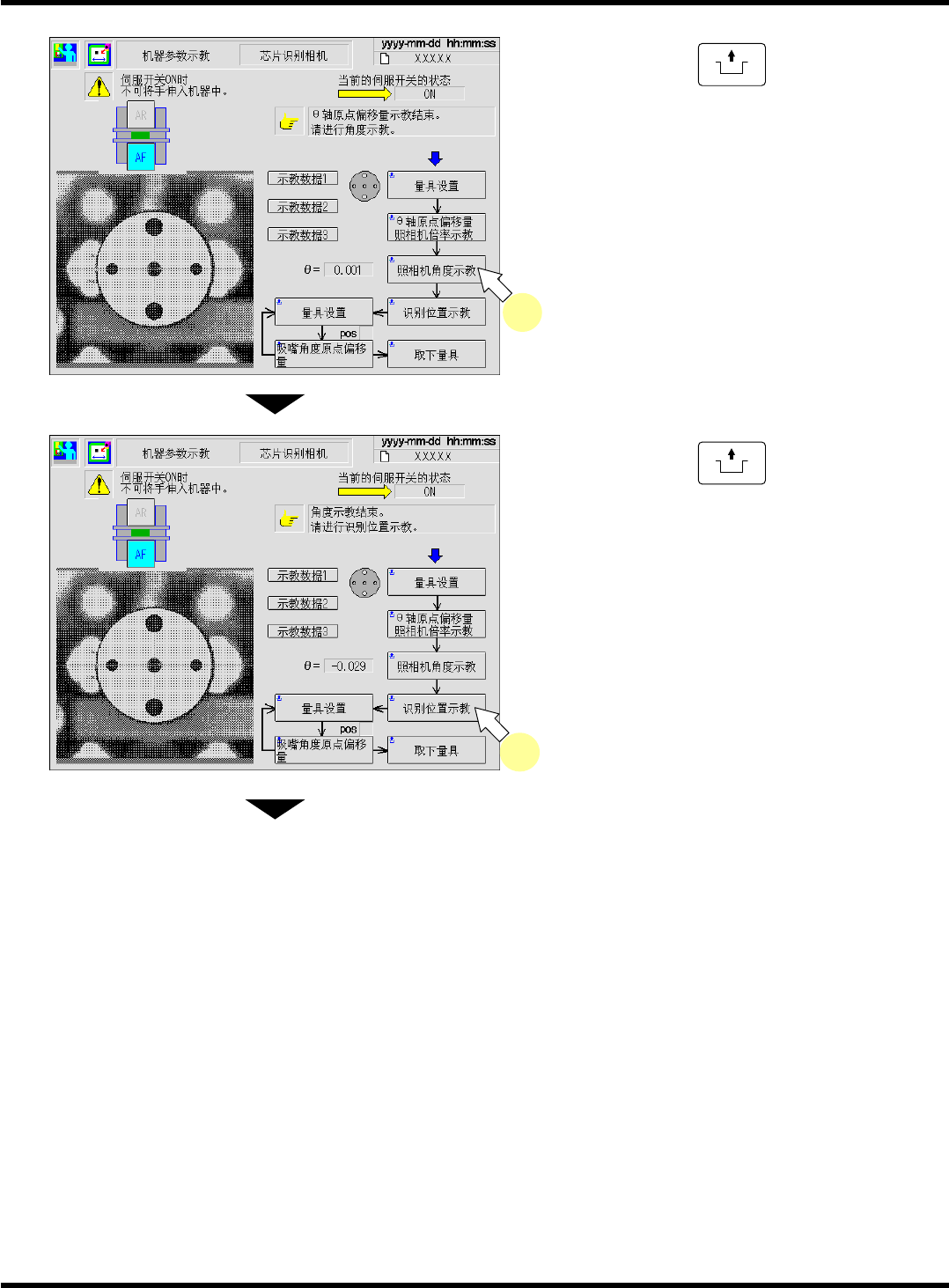 CM101-D 维修手册 2.2 机器参数的示教步 骤 Pa ge 2- 64 7. 关闭安全盖。 8. 将伺服开关置于 ON ( I ) 状态。 9. 按操作面板的 UNLOCK + [ θ 轴原点偏移 量照相机倍率示教 ] 。 10. 观察吸嘴座的方向, 如果不是 0 ° 时按 [ 是 ] , 如果是 0 ° 时则按 [ 否 ] 。请与操作面板上的 UNLOCK 一起按下。 照片为高速吸头 (12 吸嘴 ) 。 ( 设置螺钉和槽为正…