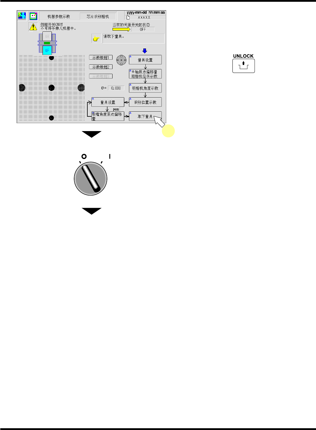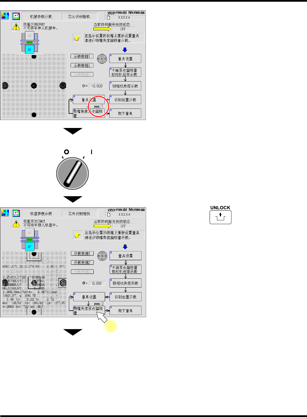 CM101-D 维修手册 2.2 机器参数的示教步 骤 Pa ge 2- 73 19. 重复步骤 12. ~ 18. 的操作,进行示教。 ∗ 反复操作完了后, 请确 认 “ 请取下量具。 ” 的信息 已出现,然后进行下一 步骤。 20. 按操作面板的 + [ 取下量具 ] 。 21. 将伺服开关置于 OFF (O) 。 22. 打开安全盖。 23. 取下的量具后,将吸嘴安装在原来的位置 上。 下一页 O FF ( ) ON ( ) S …