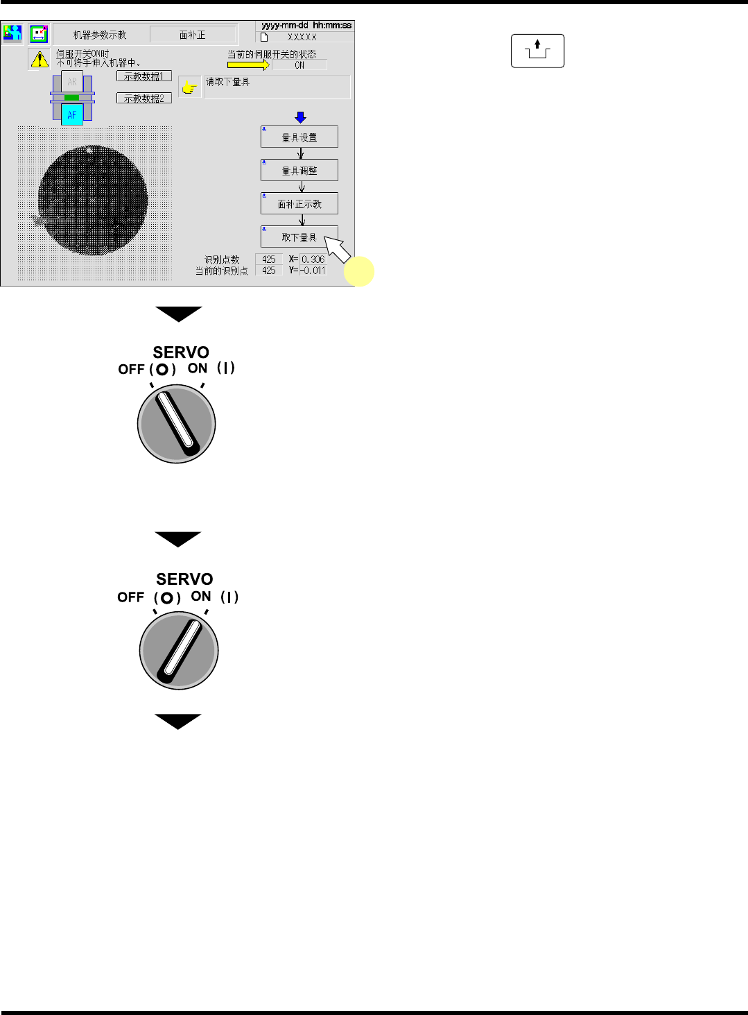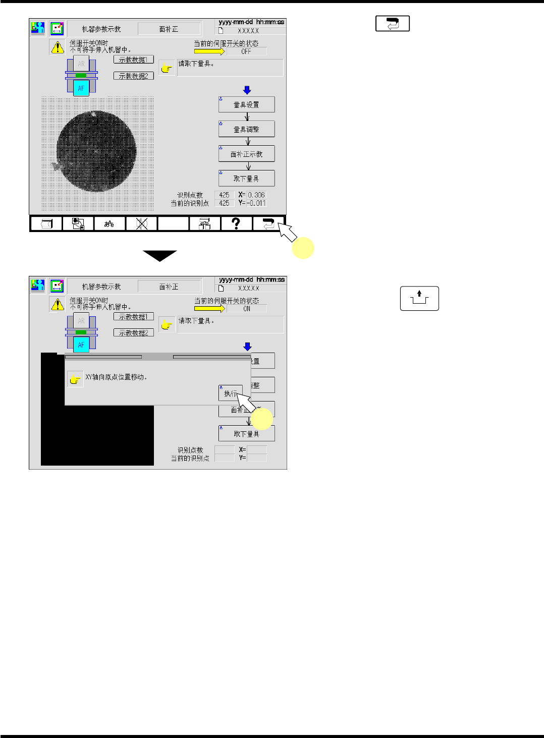CM101-D 维修手册 2.2 机器参数的示教步 骤 Pa ge 2- 87 21. 按功能键 。 22. 按操作面板的 UNLOCK + [ 执行 ] 。 ∗ 吸头移向原点位置。 EJM5B -Mp-0052 21 EJM5B -Mp-0053 22 EJM5B- C-MMC02-A02-0 0