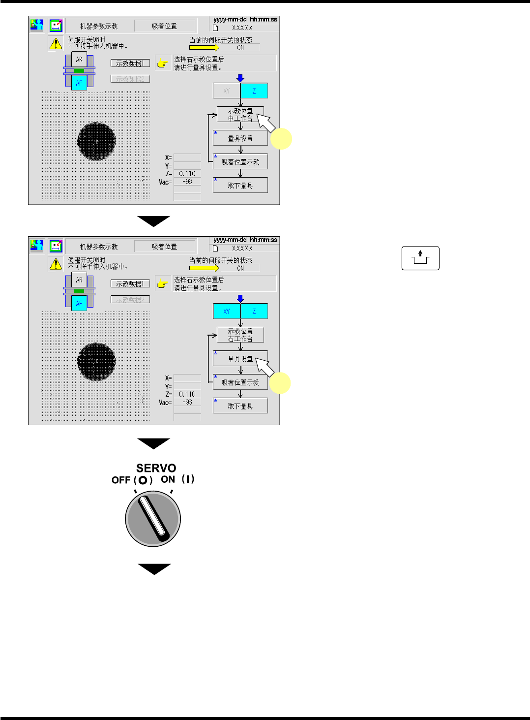 CM101-D 维修手册 2.2 机器参数的示教步 骤 Pa ge 2- 94 24. 将吸着位置量具移至所选工作台的下列插 槽上。 • 固定供料器规格 : 35 号 ( 右端 ) 插槽 整体交换台车规格 : 27 号 ( 右端 ) 插槽 25. 关闭安全盖。 26. 将伺服开关置于 ON ( I ) 状态。 下一页 EJM5B -049P 吸着位置量具 EJM5B- C-MMC02-A03-0 0
