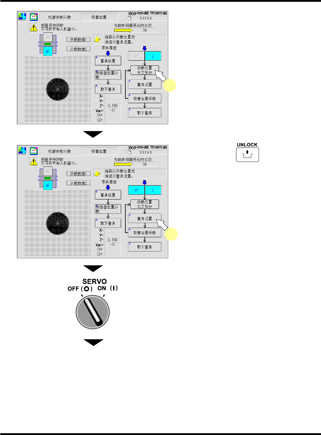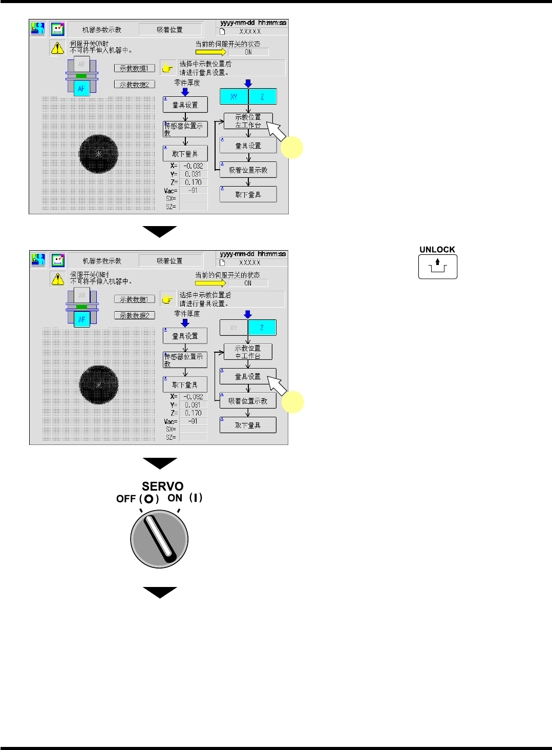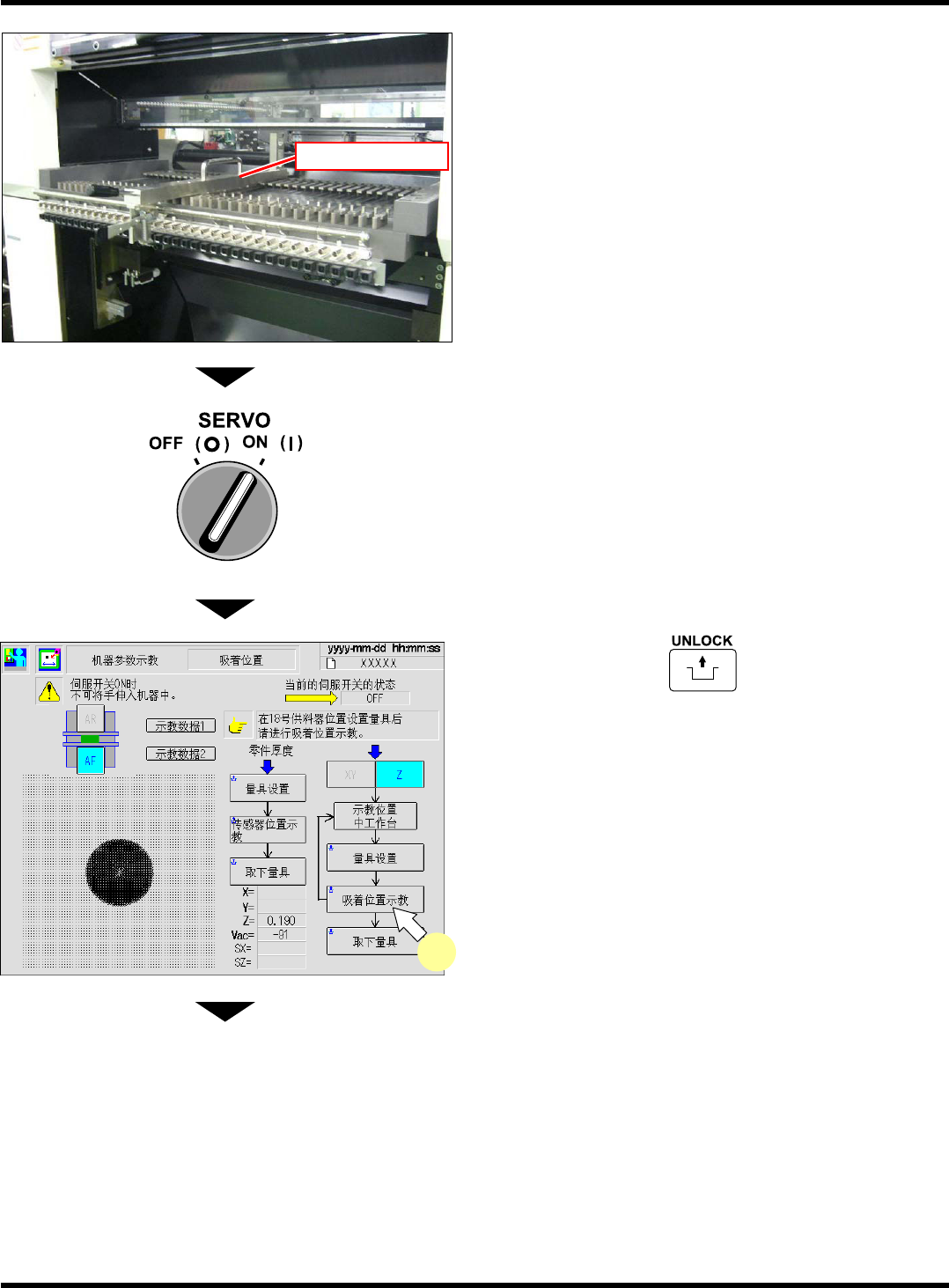 CM101-D 维修手册 2.2 机器参数的示教步 骤 Page 2-1 00 15. 将吸着位置量具移至所选择工作台的下列 插槽上。 • 固定供料器规格 : 18 号插槽 整体交换台车规格 : 14 号插槽 16. 关闭安全盖。 17. 将伺服开关置于 ON ( I ) 。 18. 按操作面板上的 + [ 吸着位置示 教 ] 。 下一页 EJM5B -Mp-0184 18 EJM5B -048P 吸着位置量具 EJM5B- C-MMC…