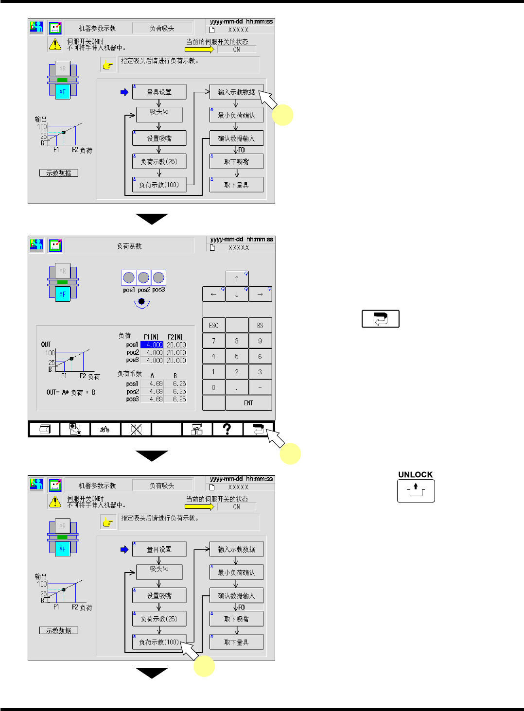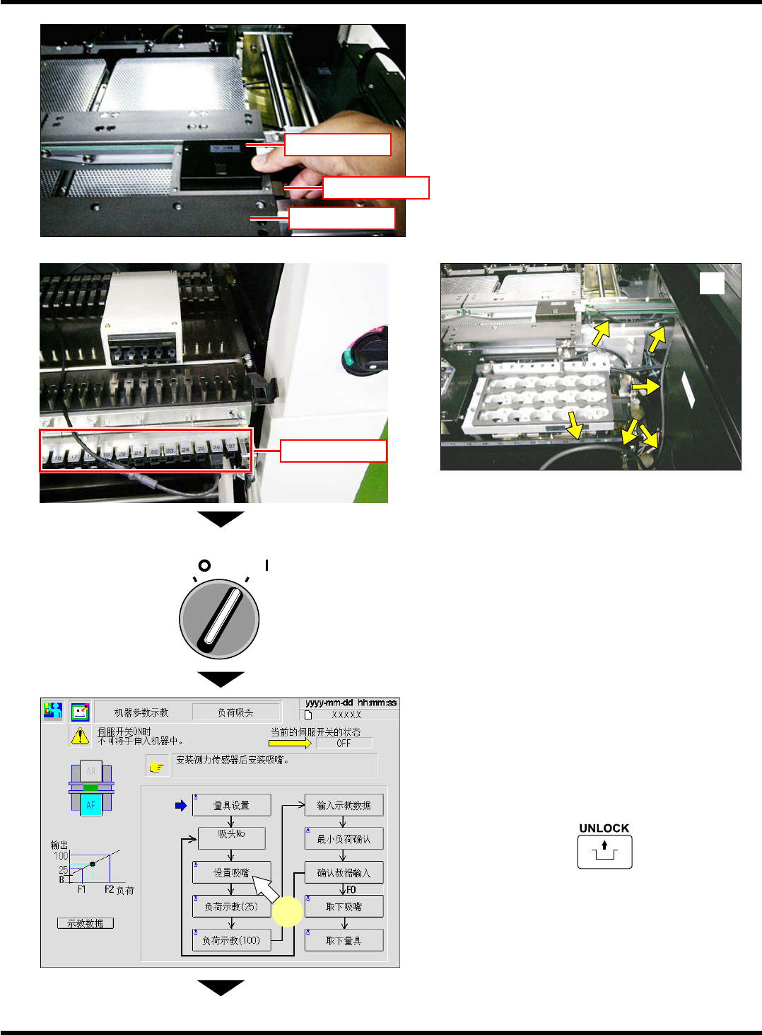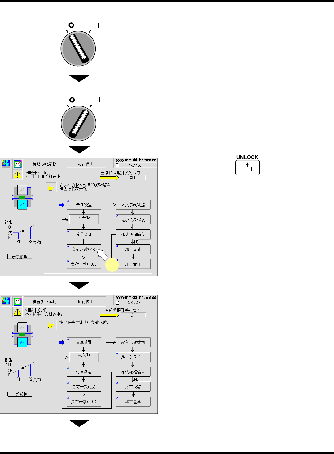 CM101-D 维修手册 2.2 机器参数的示教步 骤 Page 2-1 18 10. 将伺服开关置于 OFF (O) 。 11. 打开安全盖。 12. 将 1003 吸嘴设置到示教吸头上。 13. 关闭安全盖。 14. 将伺服开关置于 ON ( I ) 。 15. 按操作面板上的 + [ 负荷示教 (25)] 。 ∗ 28 N 吸头时,请按 [ 负荷示教 (50)] 。 • 吸嘴将下降。 16. 读取在负荷测定量具显示部显示的计测 值…