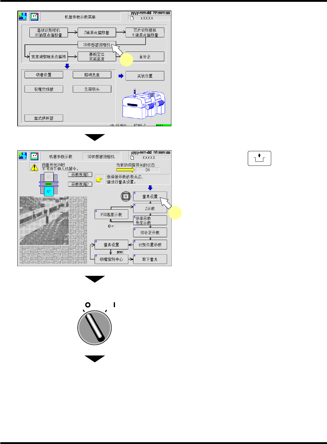 CM101-D 维修手册 2.2 机器参数的示教步 骤 Page 2-1 33 3. 按 [3D 传感器照相机 ] 。 4. 按操作面板上的 UNLOCK + [ 量具设置 ] 。 5. 将伺服开关置于 OFF (O) 。 6. 打开安全盖。 下一页 O FF ( ) ON ( ) S E RVO E53C-Mp-0023 3 EJM5B -Mp-0113 4 EJM5B- C-MMC02-A03-0 0