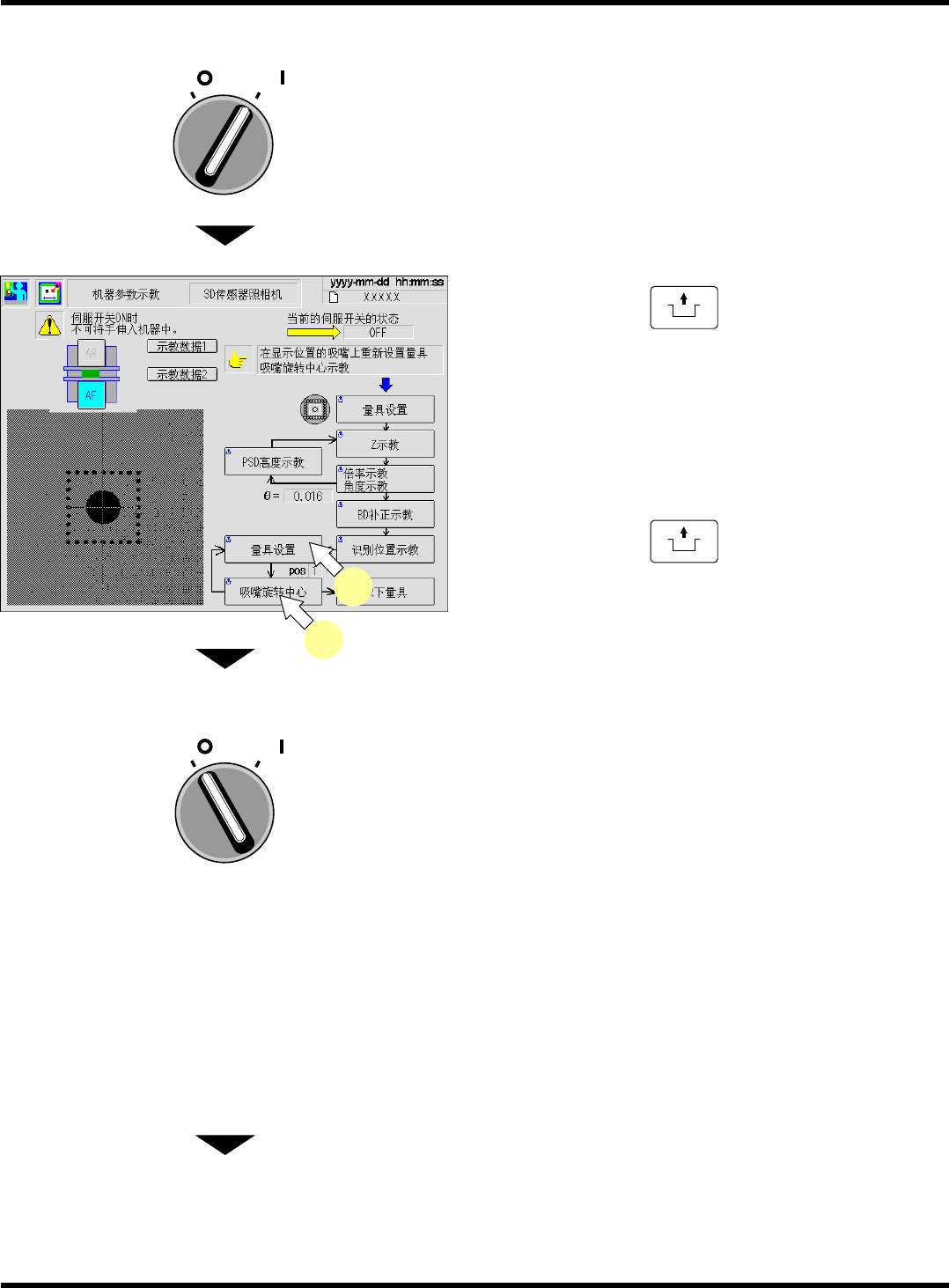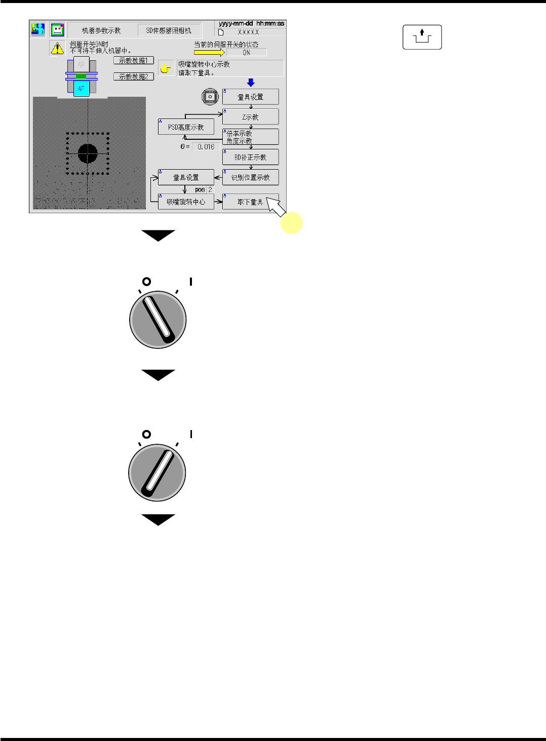 CM101-D 维修手册 2.2 机器参数的示教步 骤 Page 2-1 39 29. 按操作面板的 UNLOCK + [ 取下量具 ] 。 30. 将伺服开关置于 OFF (O) 。 31. 打开安全盖。 32. 取下量具。 33. 关闭安全盖。 34. 将伺服开关置于 ON ( I ) 。 下一页 O FF ( ) ON ( ) S E RVO O FF ( ) ON ( ) S E RVO EJM5B -Mp-0109 29 EJ…