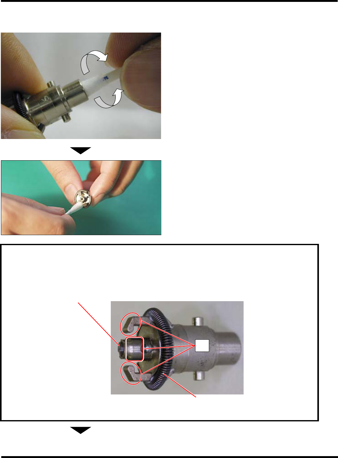 CM101-D 维修手册 1.4 140 小时检查一次 ( 一周一次 ) Pa ge 1- 58 3. 清扫 A) 吸嘴座及过滤器的清扫 1. 将棉棒插到吸嘴座里,往吸嘴旋转方向转 动 2 ~ 3 圈。 2. 用棉棒擦拭吸嘴配合面和吸嘴夹具爪的尖 端部。 要求 请不要用棉棒擦拭吸嘴座端部 ( 吸嘴过滤器部 ) 及夹紧卡爪压紧用弹簧。 如果用棉棒擦拭吸嘴座端部,则污垢有可能堵塞过滤器。还有,如果擦拭夹紧卡爪压紧 用弹簧, 则会擦掉具有防锈…
