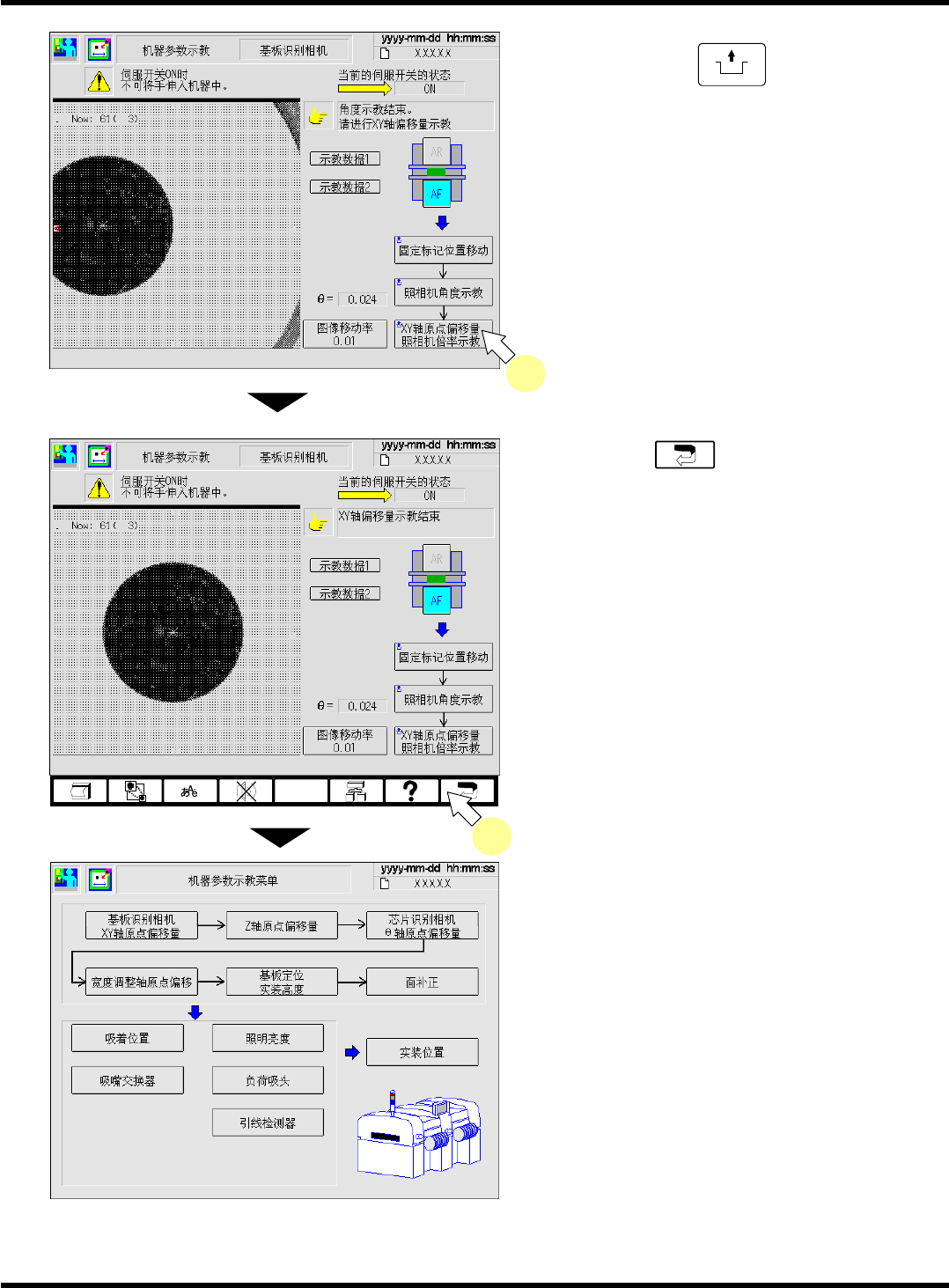 CM101-D 维修手册 2.2 机器参数的示教步 骤 Pa ge 2- 35 4. 按操作面板的 UNLOCK + [XY 轴原点偏移 量照相机倍率示教 ] 。 5. 按功能键 。 • 返回 < 机器参数示教菜单 > 画面。 EJM4A -Mp-0039 EJM5B -Mp-0023 4 EJM5B -Mp-0024 5 EJM5B- C-MMC02-A02-0 0