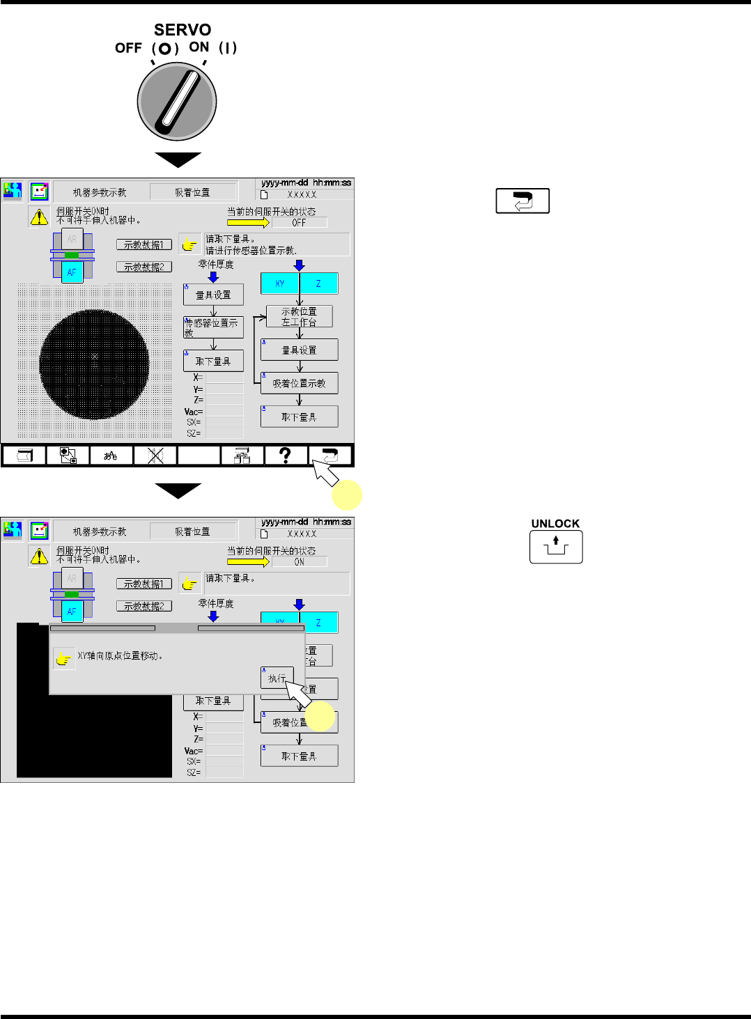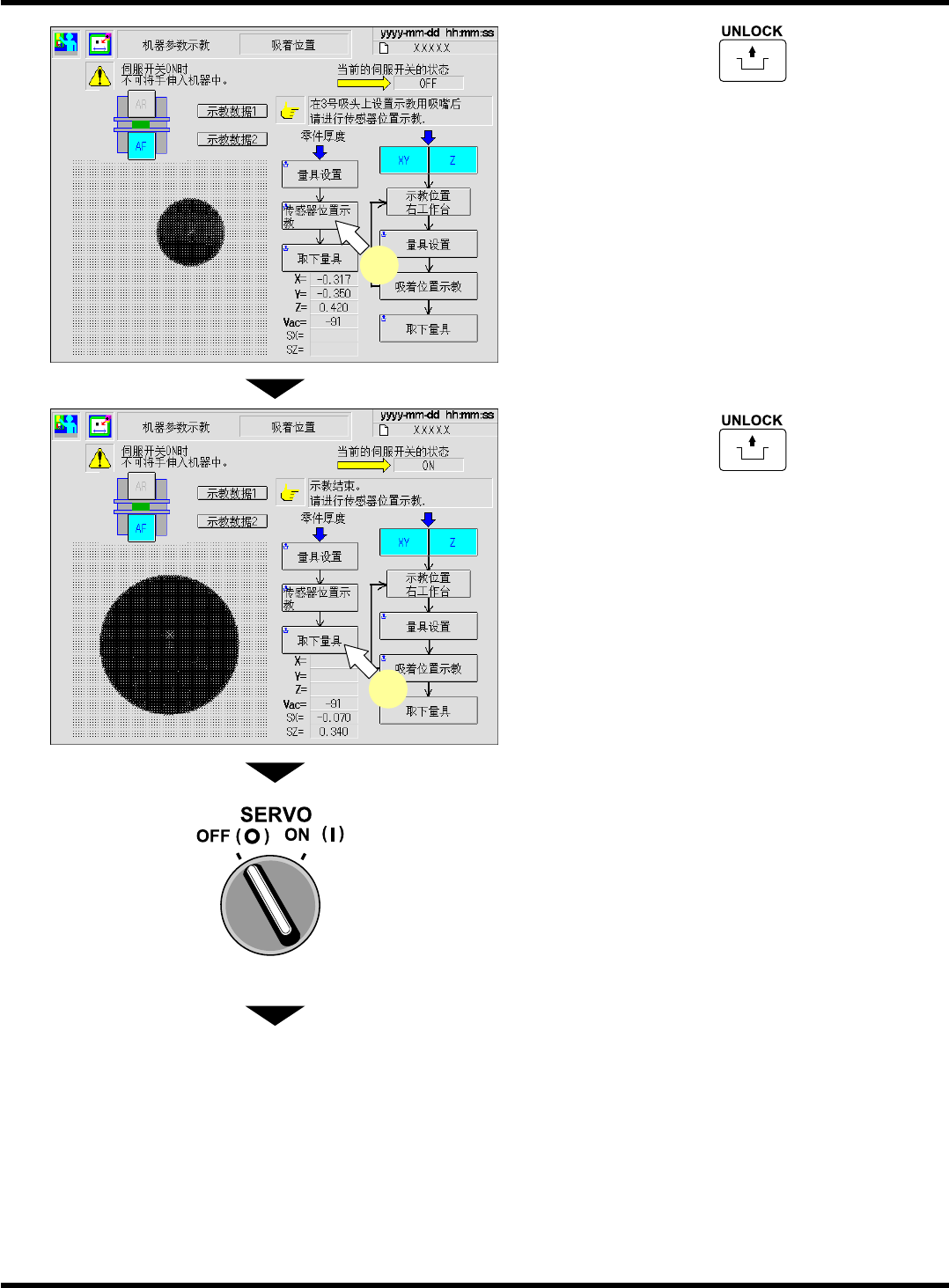 CM101-D 维修手册 2.2 机器参数的示教步 骤 Page 2-1 05 39. 按操作面板上的 + [ 传感器位置 示教 ] 。 40. 按操作面板上的 + [ 取下量具 ] 。 41. 将伺服开关置于 OFF (O) 。 42. 打开安全盖。 43. 取下吸嘴。 44. 关闭安全盖。 下一页 EJM5B -Mp-0191 40 EJM5B -Mp-0190 39 EJM5B- C-MMC02-A03-0 0