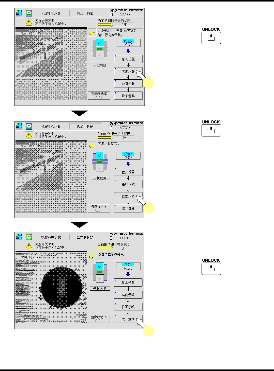 CM101-D 维修手册 2.2 机器参数的示教步 骤 Page 2-1 31 4. 将 140 吸嘴安装在吸嘴位置的 3 号位置。 5. 按操作面板的 + [ 高度示教 ] 。 6. 按操作面板的 + [ 位置示教 ] 。 7. 若要继续进行不同托盘的示教,重复进行 步骤 2. ~ 6. 的操作。 8. 按操作面板的 + [ 取下量具 ] 。 EJM5B -Mp-0104 5 EJM5B -Mp-0103 6 EJM5B -Mp-01…