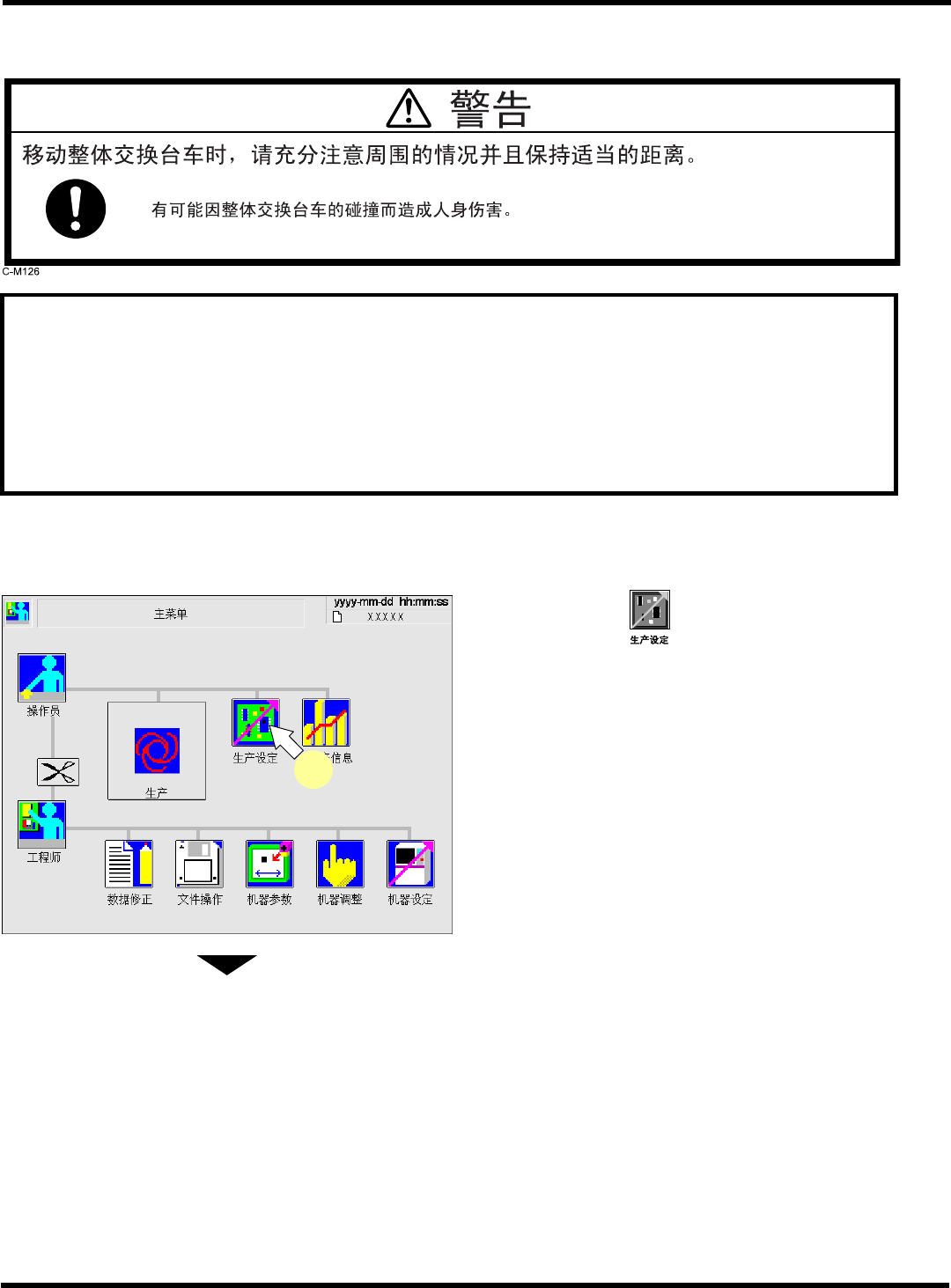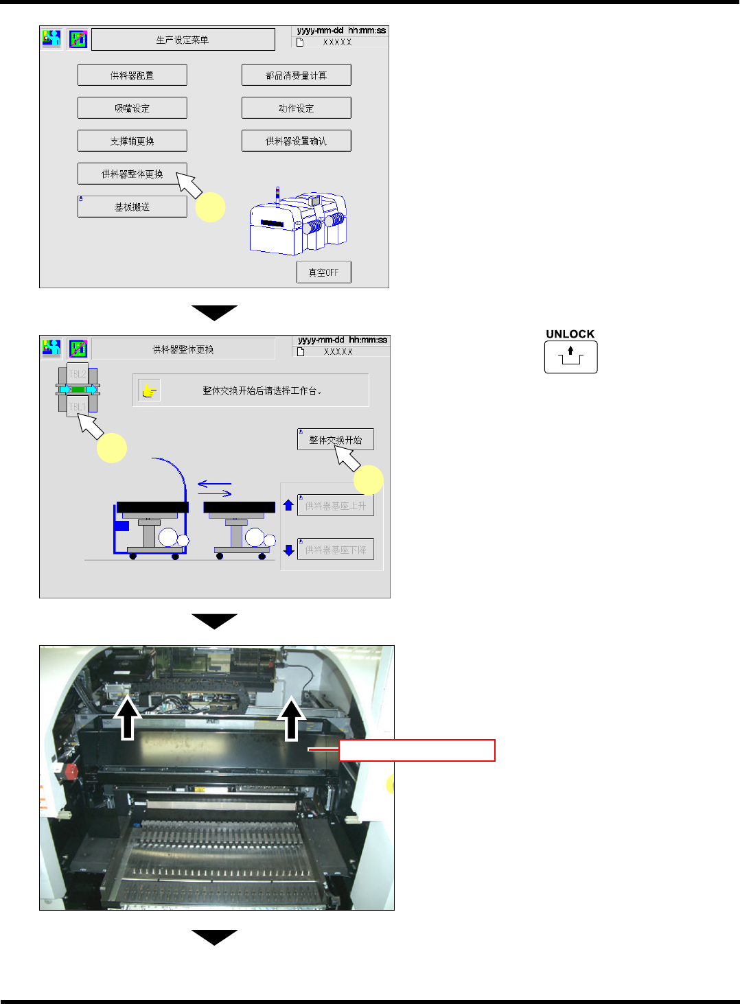 CM101-D 维修手册 1.2 检查时经常进行的 作业 Pa ge 1- 38 1.2.4 整体交换台车 ( 选购件 ) 的拆卸和安装 要求 • 该维护作业,应在电源开关以及伺服开关处于 ON ( I ) 的状态下进行。在吸头的动 作范围内进行作业时,请务必打开安全盖。 ( 当打开安全盖时,将会切断向 XY 电机的供电,以确保作业时的安全。 ) • 进行整体交换台车的安装、卸下以及搬送作业时,有可能因碰撞而导致整体交换台 车及供料器的…