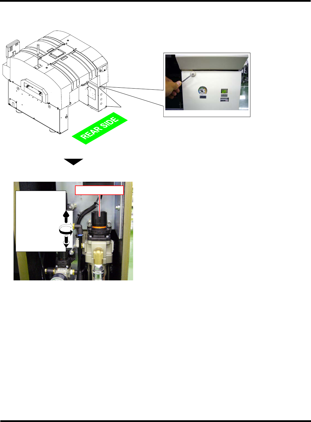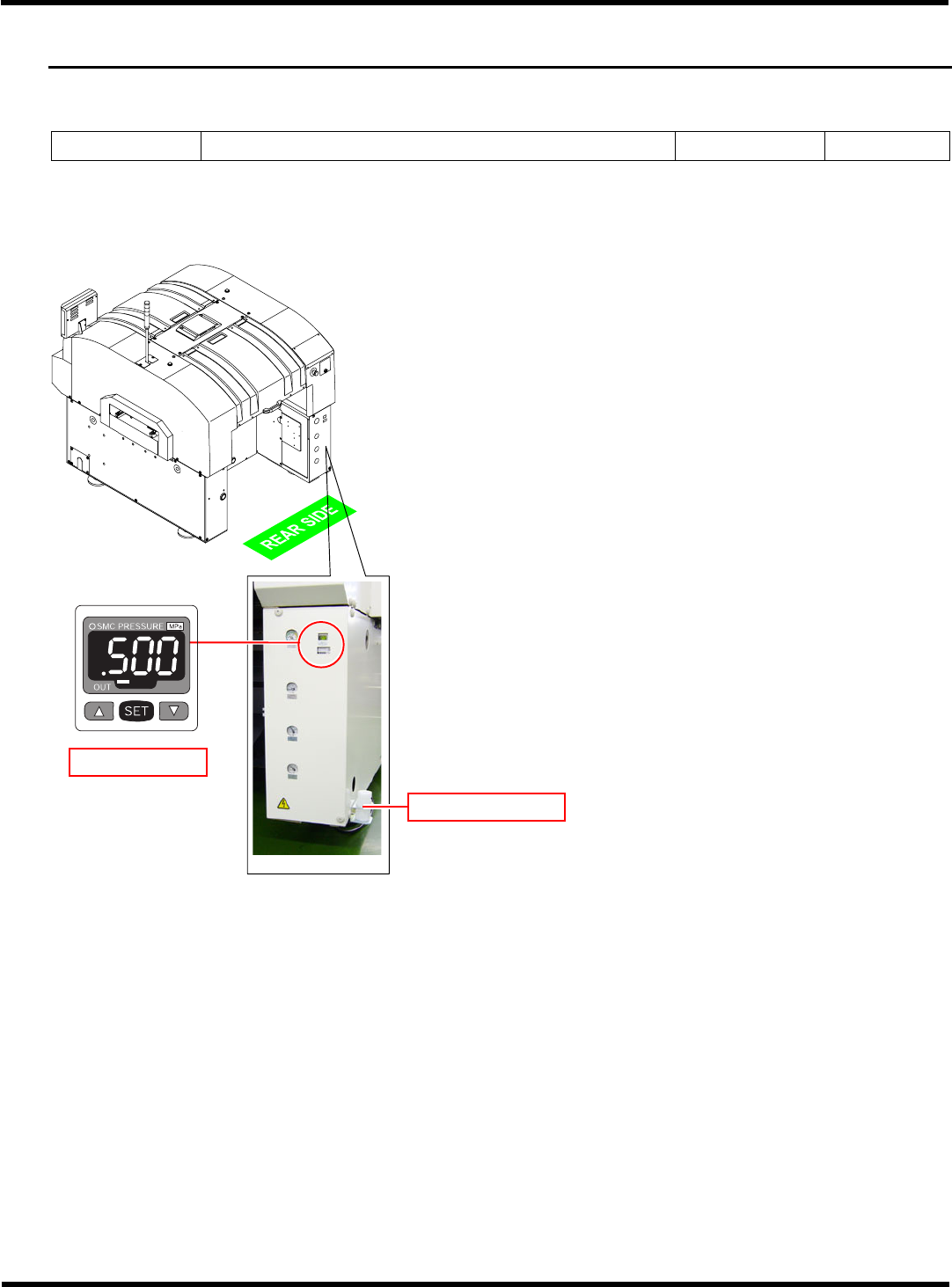 CM101-D 维修手册 1.3 24 小时检查 ( 日常 ) Pa ge 1- 47 1. 8 1.3 24 小时检查 ( 日常 ) 1.3.1 MR 装置的检查 ( 开始作业时 ) 使用工具 六角扳手 需要时间 1 分钟 请按照下述步骤确认运 转气压、检查 MR 装置的排水。 ∗ MR 装置放在设备后侧 的右下方盖内。 该作业只能在 AR 上进行。 1. 确认运转气压 ( 压力表 ) 。 ∗ 运转气压的规定值 0.5 MPa ~ 0…