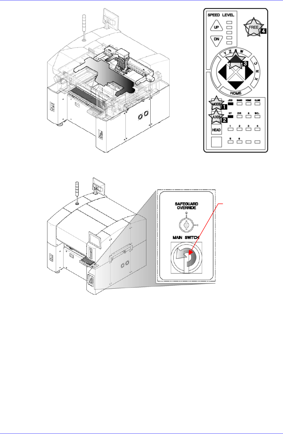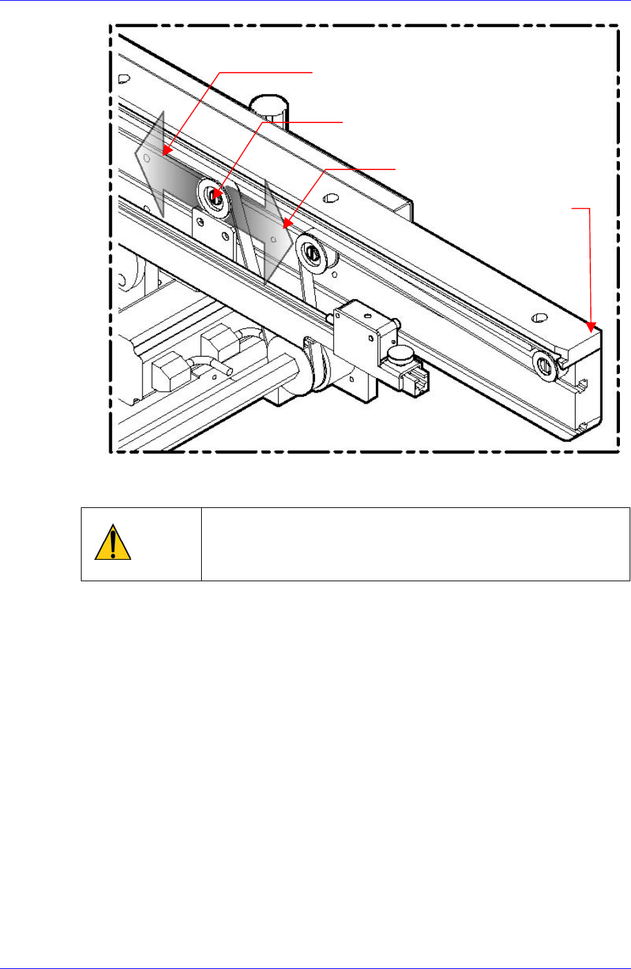 定期检验 3-21 作业空间不足时请手动向后移动磁 头组件。 关闭设备前面的主开关。 主开关的关闭方向 ( 逆时针方向 ) 输送带的张力松弛时使用一字形螺 丝起子松开 Idler Shaft ,顺着 Conveyor Frame 轨道左右移动调整张力。