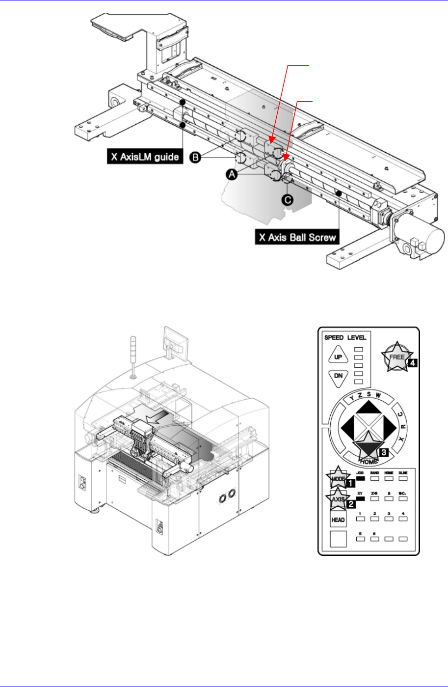 Samsung Component Placer SM320 Maintenance Refer ence 作业空间不足时手动向前移动磁头 组件。 使用本公司提供的 Cleaning Kit 的干净布块除 去灰尘等污质 ,必要 时使用小型单 向电刷在 Ball Spline 及轨面涂抹薄层润滑脂。 4.2.2. X-Y Frame 4.2.2.1. X 轴 LM Guide Rail, Ball Screw 检点 检查 LM…
