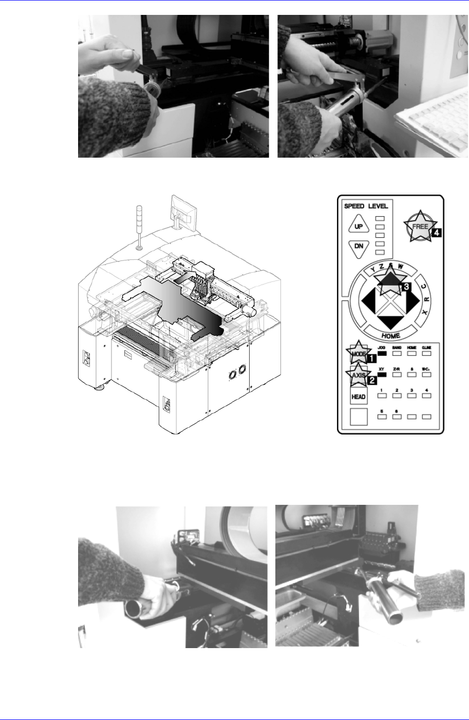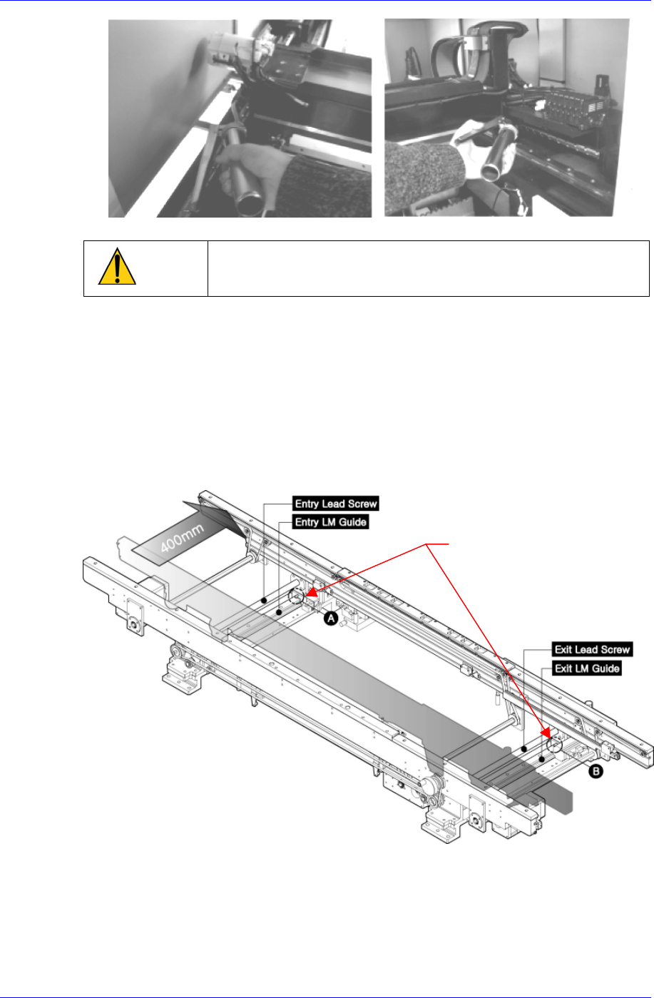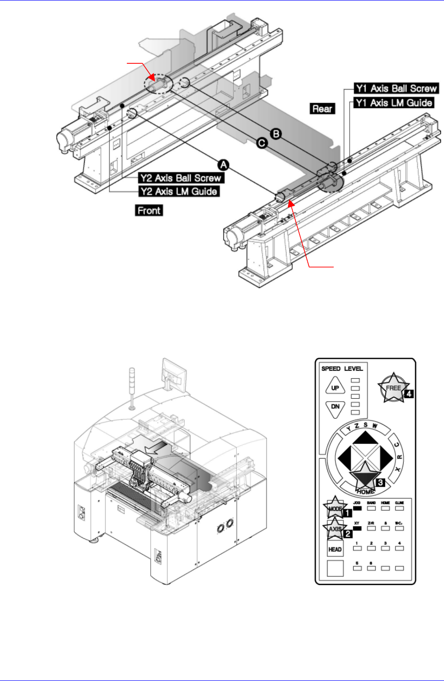 Samsung Component Placer SM320 Maintenance Refer ence 操作示教盒 X 轴移动到 Y 轴 LM 导向块的注油嘴 ( B)(C) 位于适当的注油地 点为止 。 使用本公司提供的 Cleaning Kit 的干净布块, 除去 LM 导轨和 Ball Screw 灰尘等污 质。 使用本公司提供的润滑脂注油器 , 通过设备前 面的 Y1, Y2 LM 导向块的注油嘴 ,注入适量的润…