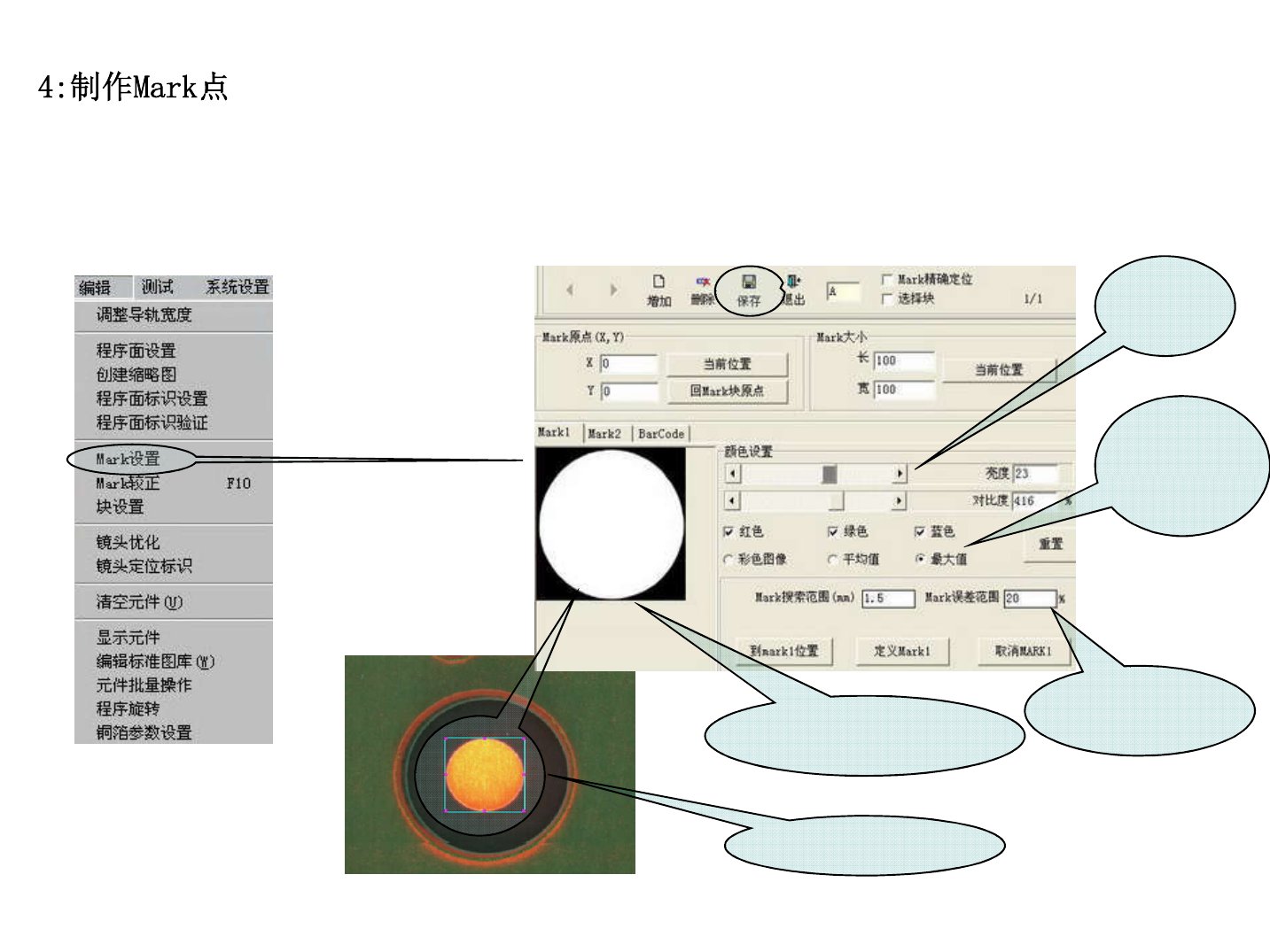 子的角落边,用板子上的选择框把mark点框住,再点击“定义Mark1”,最后调节灯光的设