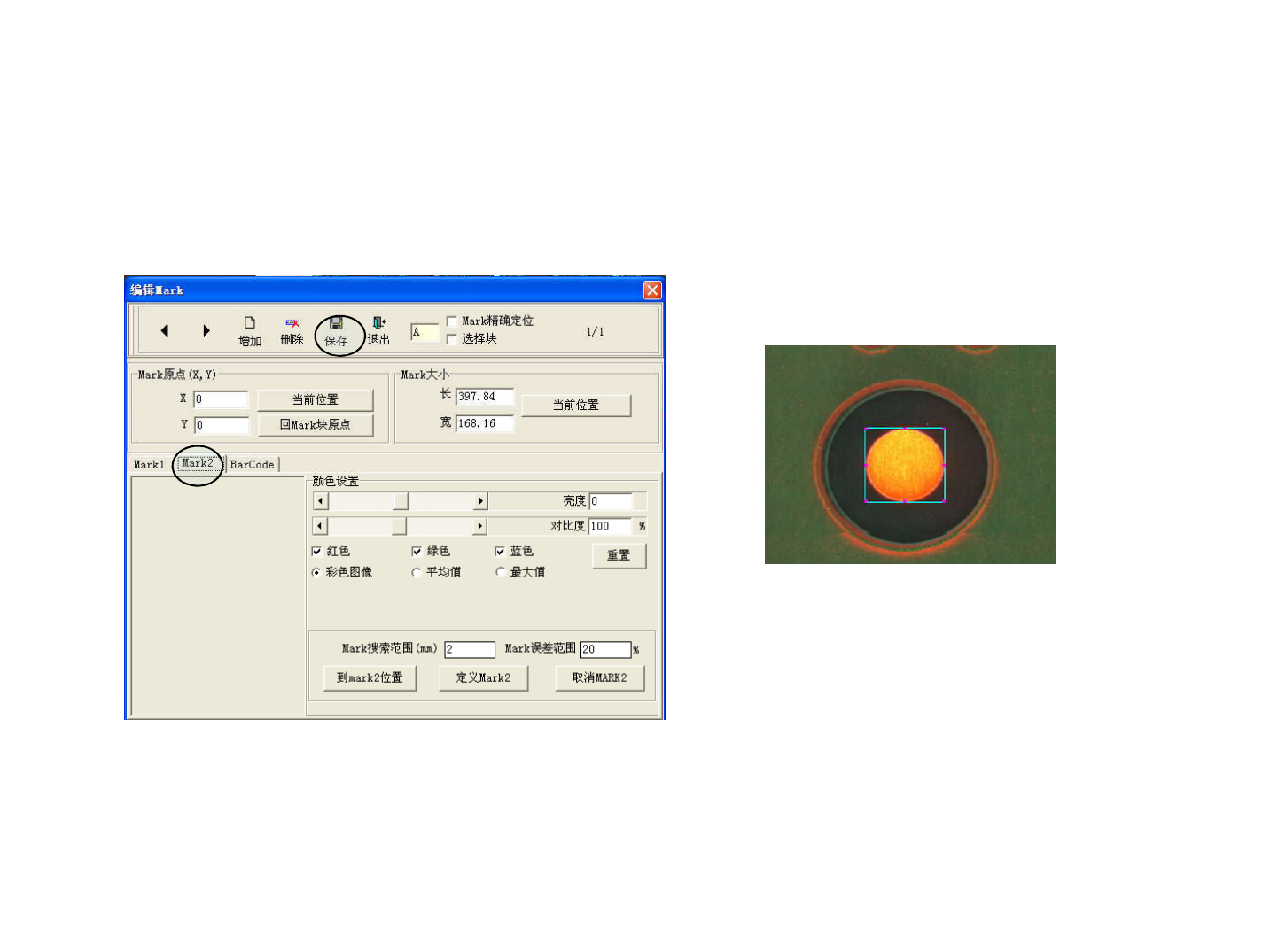 定义Mark1 后,再定义Mark 2,一般选择与Mark 1对角的位置。设定Mark2 与 Mark1 的方法基本一样,不同的是要点击“Mark2” 如下。设定完后点击保存