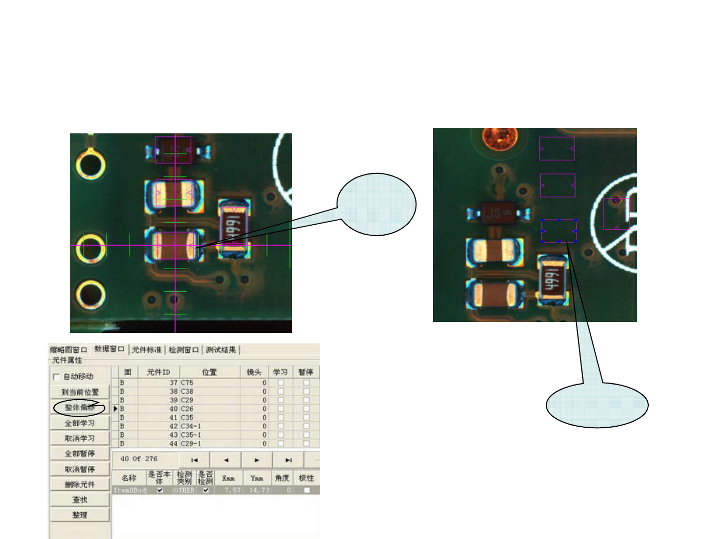 因为我们导CAD的时候,窗口与零件大致一致 ,所以窗口还 要整 体偏移,接下来,在缩略图上先找到任何一 个元件,把十字光标 移到 元件的中心,然 后在右边 缩略图上单击选 中元件所对应的红色的窗口, 最后点击“数据窗口”下的“整体偏移”。 红色窗口就与 元件一一对 应。 用十字光标 选中的元件 选中元件所对应 的窗口