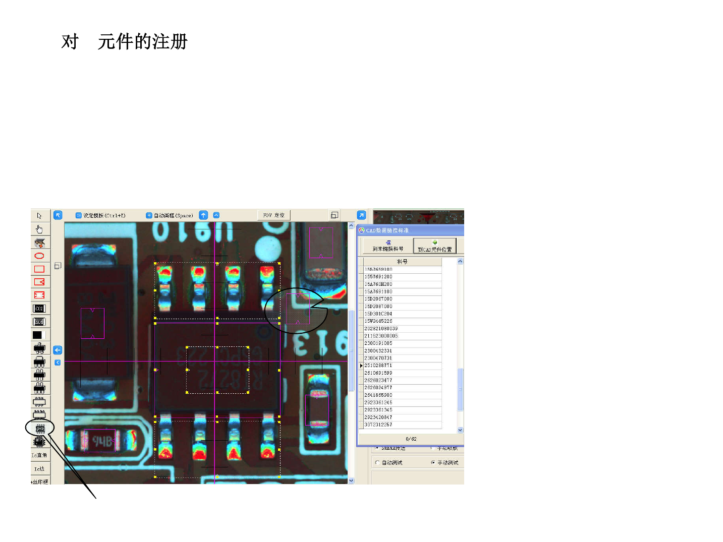 对0402电阻和电 容的注册,用单框注册,而原始的窗口默 认的是单框,注册 时,把测试窗口移到零件的中心,按右 键选择“注册标准 ”即可以进行注册 0402