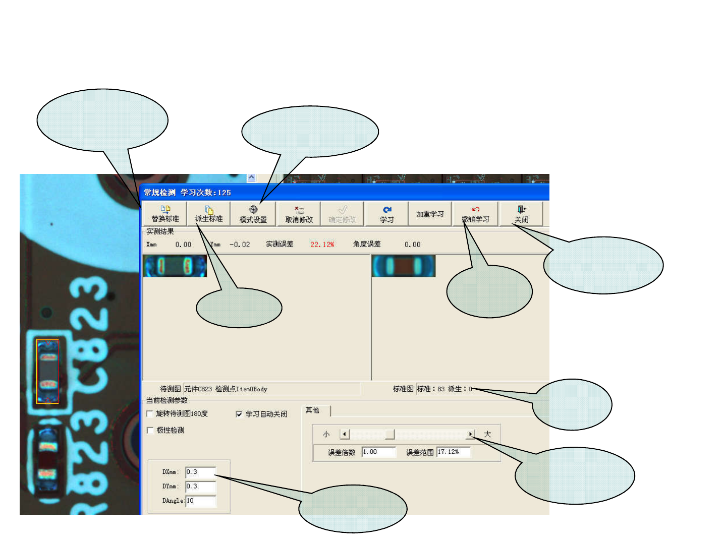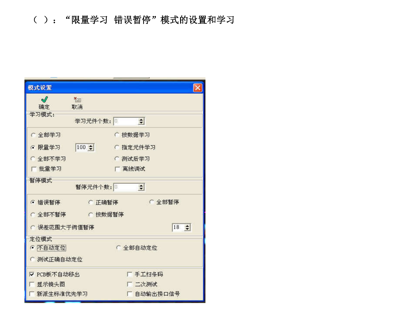如下是“限量学习 + 错误暂停”学 习模式的 设置。因为第一次选择“全部自动定位 ”, 这次学习不需要自动定位,选择“不自动定 位”。这种学习模式 是一个个零件单独 调试,所有如果调试的元件比较多,可以换板子 ,用上一种学习 模式多学几次 。 3 +