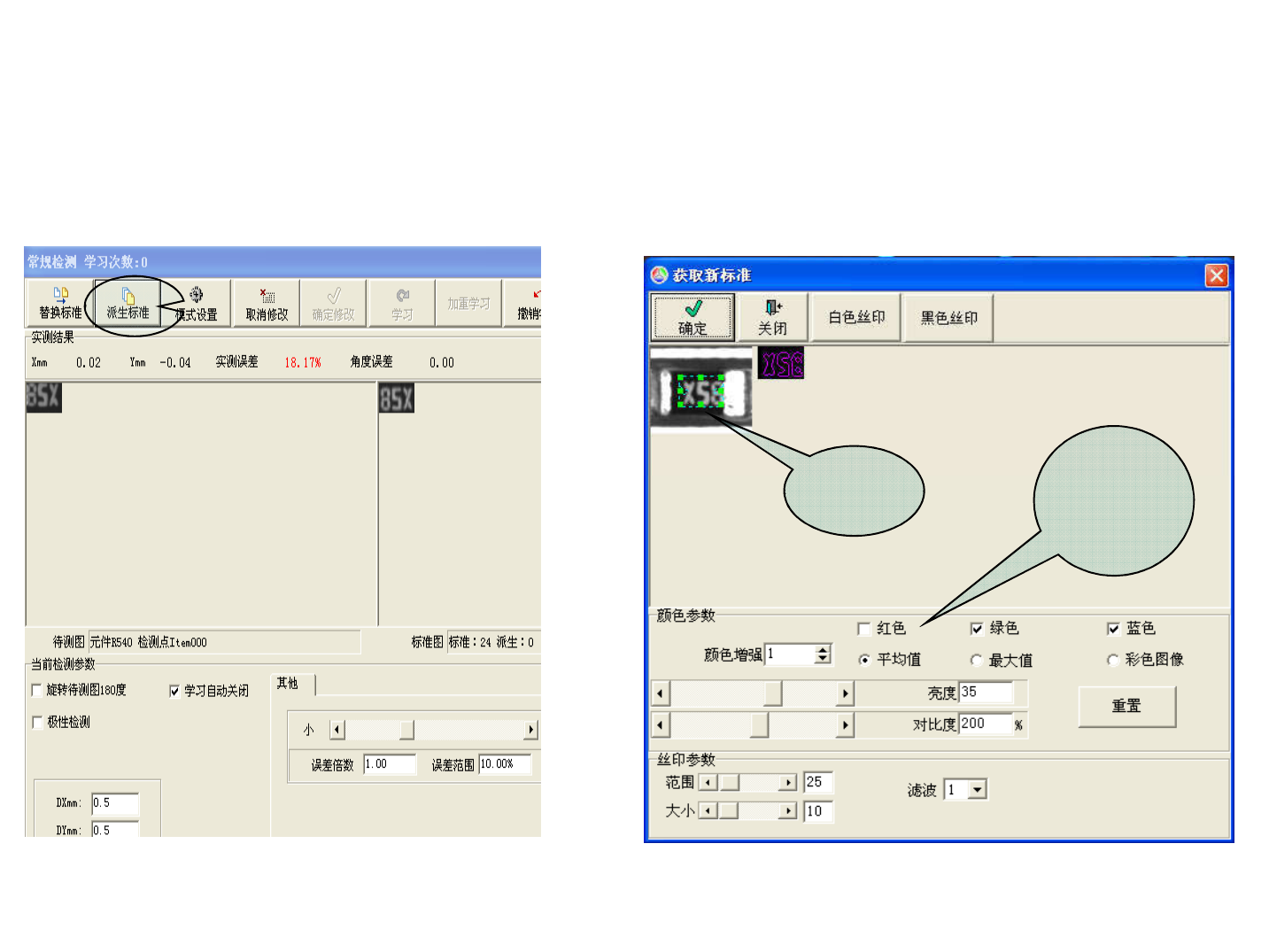 如下丝印偏位,可以调节X ,Y方向允许的偏 移范围 , 测试方式“Silk” 是没有“学习” 。 调试一般调 试允许范围或者调试误差范围,还有派生标准 调节 X,Y 方 向允许的偏 移范围 调节误差范围