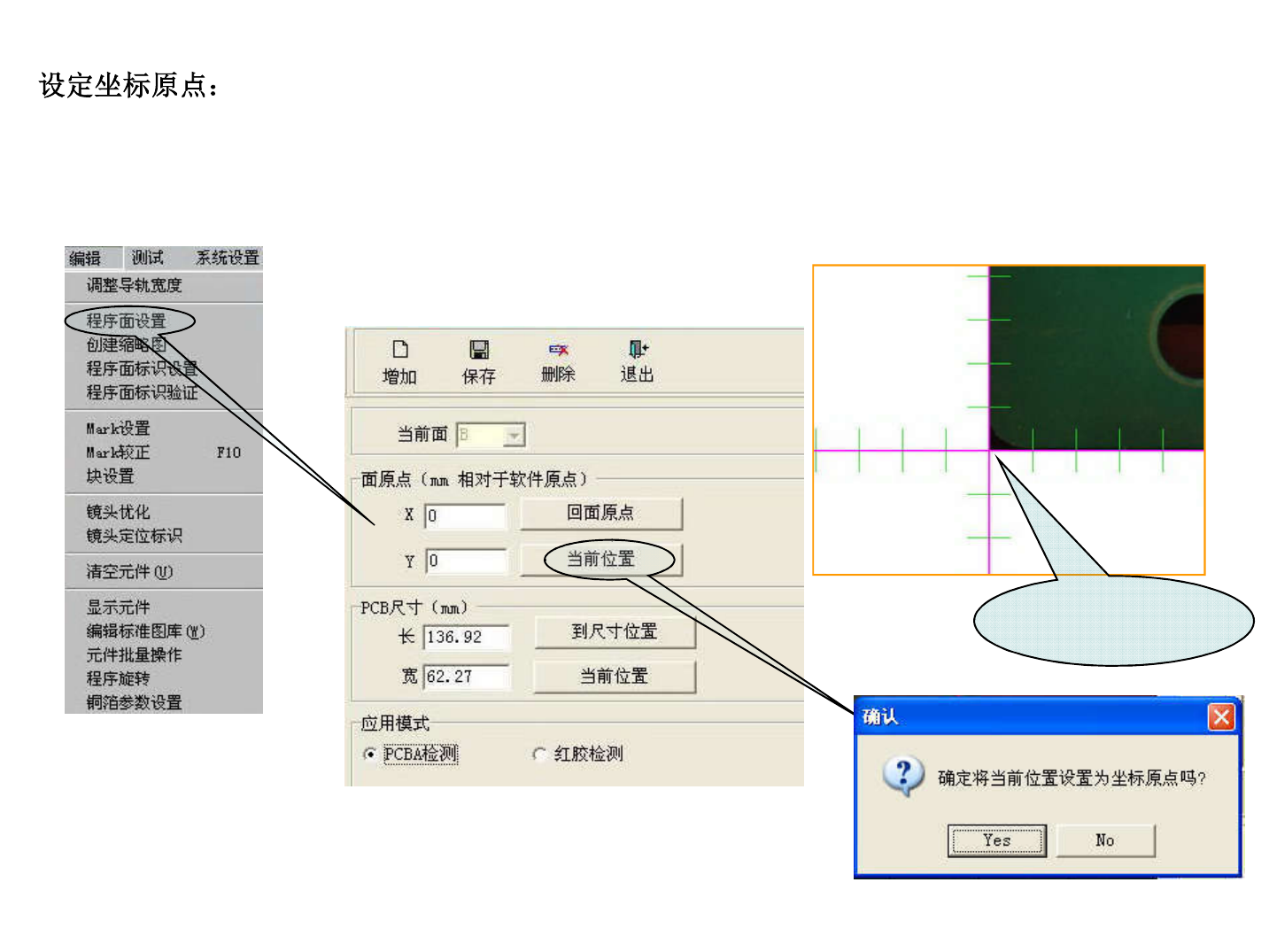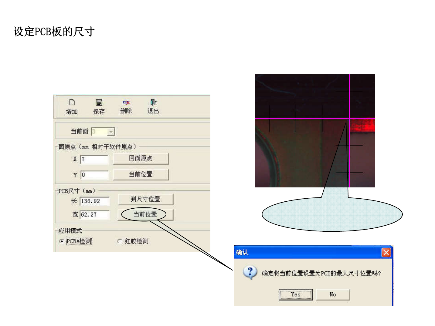 : 设置原点后,然后移动相机镜头找到板子的右上角 ,再移动十字使 十字的两边 与板子的边缘重合。然后点击“ PCB 尺寸”下的“当前位置” 。最后点击 “ Y es” 显示十字的交点就是 PCB 最大尺 寸位置,在板子的右下角